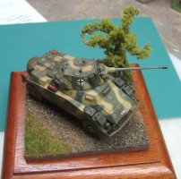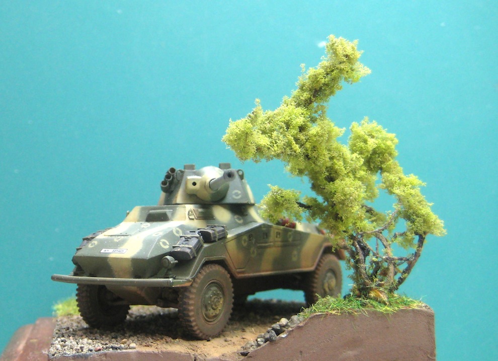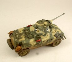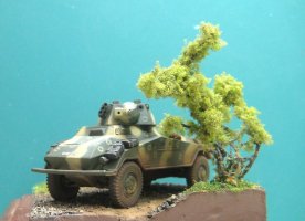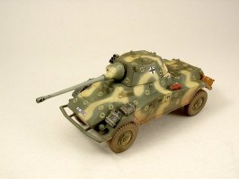 Realizing that the venerable Sd.Kfz.222 had its shortcomings, the Germans sought a replacement. A proposal was made to build a “cheaper” 234 that would have only four wheels and a smaller engine (actually half the 234 engine) but this proposal was not developed. I first saw this vehicle in an old issue of Military Miniatures in Review at the IPMS Nationals. Some months later, a hobby shop had an Armour magazine with a related article plus the Italeri 234 kit both on sale for less than half price. This was a sign: build me! So I bought the kit and magazine, and set to work converting eight wheels to four. The first issue was where to make the cuts for shortening the body. The kit body is in two parts, top and bottom. The top would be sectioned in front of and behind the radiator grille work. So these sections were cut out and the three remaining pieces glued back together. Shortening the top created a step in the side panels, so some plastic sheet was added and sanded until this was smooth. The bottom didn't require this precision. One section was removed which included the mounting for one axle. This section had to equal what was removed from the top. The “third” axle mount was filled using scrap white plastic. Some suspension detail was added but not the steering as Doug did in his build review of the Italeri Sd.Kfz.234/2 (which can be seen here). The bottom was longer than the top aft of the last axle, so another section was removed to shorten this area. Later some plastic was added to the rear to match the upper body. Next, the top was dry fitted to the bottom and the spacing for the front and rear wheel checked. Then the two were glued together. The side fenders/storage were fitted and one section removed to match the overall length of the body. The cut was made just ahead of the front radiator. The section was removed from the aft area because the front of the kit body had not been disturbed and the kit fender fit, well almost. Some plastic was cut to fit into the third and fourth wheel well gaps. There was much putty and sanding to smooth this. The modified fender required an additional strip where the fender touched the body. This strip was sanded and adjusted until there was a tight fit. For some reason, the kit mufflers would not fit, so these were sectioned and new pipes added with white plastic rod and then drilled out. While I was in the mood, I made new vision visors, lifting hooks/eyes, handles on the jerry cans and gun barrel. In hindsight, the hatches should be open with crew...but this was enough at the time of building. The model was primed and painted in a two tone scheme found in the MMiR article. That article also featured the stenciled circles, which were duplicated by making a stencil and spraying through the stencil onto clear decal paper. There was a high reject rate but the good ones really add a lot to the model. The other decals came from the kit. After application, the model was flat coated and weathered with oils and MIG pigments. After these pix were taken, the model was weathered more with pigment/dust and mounted on a scenic base. The Armor magazine had picture of this vehicle with the Sd.Kfz.222 style turret, but personally I like the turret from the Sd.Kfz.234/2 as shown in the MMiR article. |