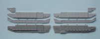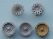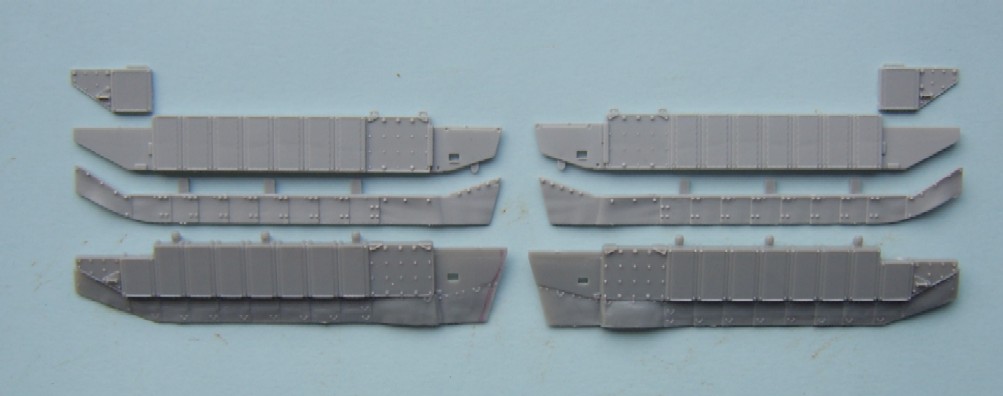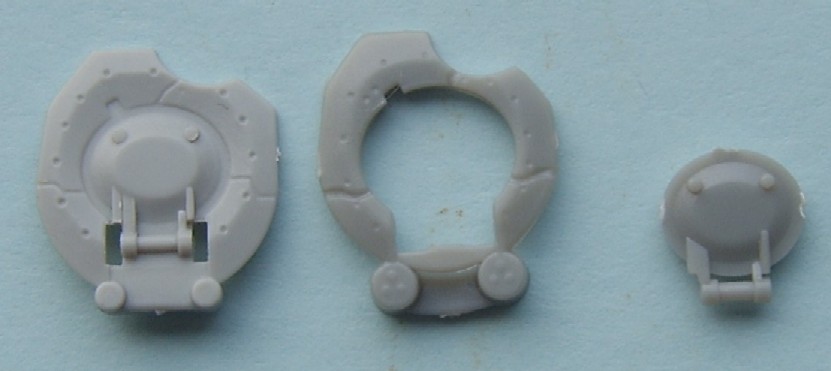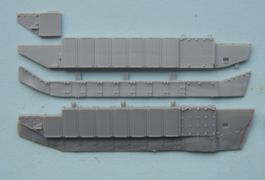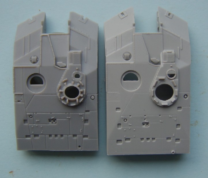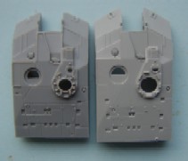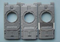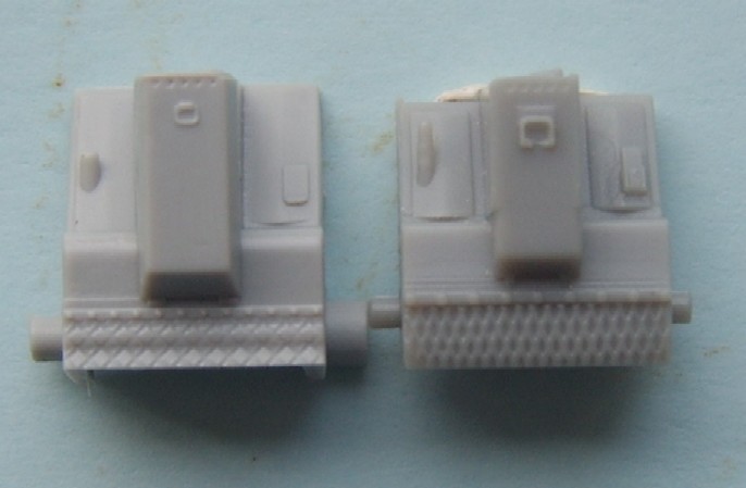 The Jerry can holder, as can be seen both a similar and both have jerry cans moulded in place, if I had to choose between them I would pick the Trumpeter, although for the first aid kit and telephone the Dragon one is better. The exhaust shrouds, the difference in length comes from the fact that the Dragon exhausts are in the wrong place, mounted too far forward on the hull due to the size of the engine deck. Both have a similar profile, but both sit slightly too high The add- on Armour, as can be seen the dust skirt on the Trumpeter kit is a separate piece, as the armour is also used for the KFOR version, to this end the frontal portion is a separate piece as the KFOR option is also different. The Wheels from left to right Trumpeter, Dragon and my favorite Revell, the Sprockets are reversed with Dragon being first The Turret With the Hull done the Attention turns to the Turret, at a quick glance the Trumpeter looks to be great, the gun sight is the correct shape and length, the sight mounted just to the left of the main sight has better relief than the Dragon kit and the loaders periscope is also better but if you look at the front plates of the turret you can see that the Trumpeter ones are noticeably bigger than the Dragon plates, the Dragon ones are correct. Turning the Turret on to it's side it becomes noticeable as to why the front plates on the Trumpeter turret are bigger, the Turret is squashed for want of a better phrase, the Dragon turret roof has the correct height, the Trumpeter side wall profile is correct at the rear with the stowage bin running parallel to the hull and not angled downwards as in the Dragon kit. the front portion of the Dragon kit has the correct profile for the Challenger with the Trumpeter one being incorrect in this area.The Trumpeter turret although correct in profile is slightly too long making the rear longer than it should be The Commanders hatch, although the Trumpeter hatch is moulded closed, the hatch is the better with the two round housings at the rear being the correct size compared to the oversized Dragon ones, here the best thing to do would be to remove the moulded in Trumpeter hatch and replace it with the Dragon hatch. The Loaders hatches, here Trumpeter have the correct hinge sizes, but the hatch is the wrong shape, the Dragon hatch is the correct shape but the hinges are wrong, the other hatch is the other type supplied in the Dragon kit The Gun Barrels are very similar, but the Dragon barrel needs to be turned 1/4 turn to line up the thermal sleeve, to explain this better the indentations on the Thermal sleeve should be in two groups of 3 with a larger gap between the two groups, the groups should be aligned top and bottom with the wider gap running down each side, on the dragon kit this gap runs along the top of the gun, on the Trumpeter kit it seems to need a 1/8 of a turn to line the gaps up correctly The gun mantlet and TOGS housing, this is the easy bit with the Trumpeter one having the correct shape size and profile and can be used directly as it is. The GPMG, here Dragon have the better rear ends with Trumpeter the better front ! just to be awkward, that being said the Dragon ones are very thin and to my eye too thin The independant commanders scope, this is good fun !! not ! Dragon have the correct height and trumpeter the correct width, it is easier to change the Dragon one by adding thin plastic sheet to the outside and replacing the bolt detail the Smoke dischargers, I think that here it comes down to personal choice, I find Dragon s to be better although others might see Trumpeters as better.