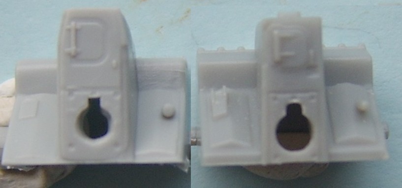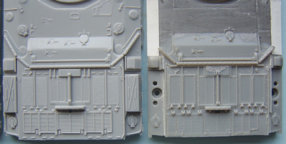 With the release of the Trumpeter Challenger 2 I thought that it would be a good idea to do a comparison between the two. Both are not perfect and unfortunately there is no easy fix for either of them. I suppose that until someone releases a good Challenger 2 the only way forward is to kit bash the two, but even that is not as easy as it first seems as it is not just a simple case of swapping parts, there are still alterations that need to be done and in the end it will come down to which is the lesser of two evils or how far the individual wants to go ! there are those who moan and do all they can about a Sherman that is not correct, or about a Panther or whatever it is they like the best, for me it is Modern British and Russian vehicles that I can not accept faults on when building a kit. In the following Comparison the Darker Grey is the Dragon kit with the lighter being the Trumpeter. The Hulls I will start with the upper hull size wise they are both the same and it is just in details that they differ, but it is a big difference. I have said before that the Dragon engine deck is too long and have even shown how to correct it HERE, for some understandably this may be a bit too much work. The good news is that the Trumpeter engine deck is the right length, unfortunately the rest of the details on the Trumpeter kit are very simplified, the Dragon deck is the better detailed but needs shortening and modifying on the rear right hand corner.The exhausts on the Dragon kit are slightly too far forward, this is rectified when the kit is altered, they are also slightly too small. I have also included the hulls against the Tankette drawings, showing how the two kits are different and how the Trunmpeter turret sits too far back from the front. Here you can see the difference in length of the engine decks the hull on the right is a modified Dragon hull, Closer inspection of the front will show that the two kits differ, here again the Dragon kit is correct A comparison shot of the Trumpeter and the Modified Dragon engine decks as can be seen the alterations have corrected the length of the engine deck. The Trumpeter and an unmodified Dragon hull, it is clear from this shot just how out the Dragon rear hull is. The lower hull, the Trumpeter kit has the correct wheel spacing's. The rear Plate, both have the same moulded on details. On both kits the fuel drums and their holders are moulded as one piece, the details are correct with the Dragon ones having a bit better relief but still not enough.