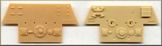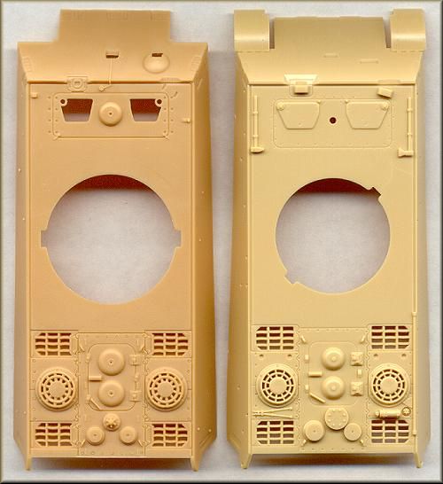 Revell takes the lead from ESCI with the turrets. The ESCI turret is a bit too elongate, with the turret roof a little too narrow. Although it appears in this scan that the ESCI turret is much longer than the Revell, it is deceiving, because the Revell turret does not have the front armored face attached, which is a separate part. With that part attached, the two turrets are essentially the same length. The width of the base of the turret is also very close, with Revell being just a little bit wider than ESCI. The walls on the ESCI turret have too steep of an angle to them, that is why the turret roof appears too narrow. Notice also the difference in the turret roof details, such as the location of the vent cover, close-in defence weapon port, and the spent shell ejection port. Suffice it to say that the location of these items on the Revell turret are correct. The Revell part also includes the pilzen (crane mounting sockets), seen on later examples of the tank. Not shown here is the rear hatch; both kits mold this hatch very well, with Revell having the armored hinge covers, which also is a feature of later tanks. Given the technical accuracy of the Revell turret, it is clearly the preferred part here, but most of the problems on the ESCI turret will only be noticeable to someone with scale plans in their hands. Rear Hull