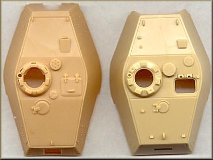 There really is not a lot of difference between the two hulls, and for this component, I feel that the older ESCI part is better than the Revell. Revell has the front fenders molded onto the hull, giving the modeler the option of adding the side skirts. For the ESCI kit, the fenders are molded with the side skirt parts. Both kits have excellent detail: recessed hatch lines and bolt holes, engine grates molded through the hull, detailed hinges, and all of the appropriate accoutrements. But I feel that the areas where the ESCI kit beats the Revell kit are: the open hatches, separate periscope covers for driver and co-driver, no pioneer tools molded onto the hull, and the electrical wire for the headlight. But in Revell's favor, at least they include pioneer tools, even if they are attached to the hull; the ESCI kit includes only a couple of tools, and none of them are the ones we see on the Revell hull. Also, Revell depicts an armored cover on the center air vent (directly between the wire cutters and fire extinguisher). I'm not sure what ESCI was trying to achieve with theirs. It almost looks like an antenna mount, which Revell correctly molded immediatly to the right of the fire extinguisher. Despite that, if I had to choose, I'd say that ESCI has the better hull. Turrets