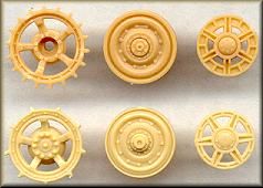In this scan, the ESCI barrel is on the top, Revell is in the middle, and I've included the turned aluminum barrel produced by ARMO at the bottom for comparison. I tried to line up the barrels at the right to show comparative lengths. As you can see, all three are different, but determining which one is correct is problematical, since none of the references I own seem to agree (listed below). The most dependable reference that I usually tend to follow is the Achtung Panzer volume, and for this review, I've compared the the measurements of the kit parts to the drawings in that book. The ESCI barrel is simply too large, measuring about 3.5 mm too long, and is shaped incorrectly. The baffle is a little too massive, but can be sanded down to proper size. The Revell barrel has the correct shape (i.e., correct proportional lengths of barrel segments), but is also about 2.5 mm too long. The ARMO barrel perfectly matches the dimensions in the Achtung Panzer reference. I think the best option here is to use the ARMO barrel with the baffle from the Revell part. Wheels