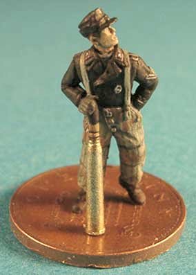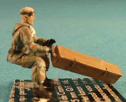 | FIG 3: Figure 3 was holding a cup of coffee, had a beard and was facing the opposite direction so all I did was replace his head looking into the sky and his right hand to hold a shell. (You can see the quality of the shells produced by Tony Boustead in this picture, they come in many different calibres and with various casings and the detail is really delicate.) I tried to get a bit of scale perspective by placing this figure on a one penny as it is easy to forget how small the 1/76 and 1/72 scale figures are while looking at them on the computer screen. His face is actually a little lighter in real life. |
