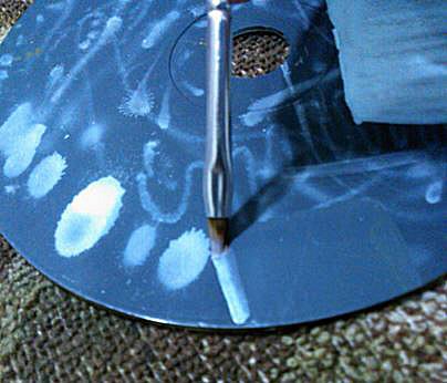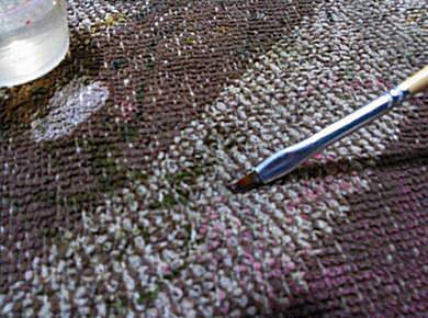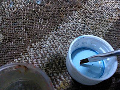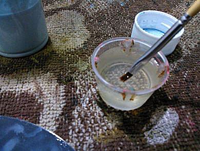 Touch the dark colour (light in this example) with the tip of the brush. Remove the excess of paint on a towel, if needed.