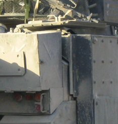 The MRV has also been seen fitted with Chobham armour panels down the sides. On the right-hand side it is the same as the infantry vehicle, which allows no access to the stowage bins behind. On the left-hand side it is the same but the panel stop at the NBC compartment to allow access to the crane. Bar armour is also fitted, but has a slightly different arrangement near the crane allowing access to the controls. No bar armour is fitted to the rear. The vehicles mount the same frontal armour as the infantry vehicle with the A frame being mounted on the front of the armour.