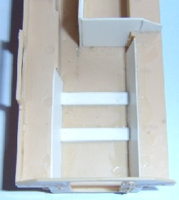 print out correctly for the model. Aside from the doors the rear bins are dramatically changed in that they are taller and longer. The left hand bin houses the mast used to raise the MSTAR system higher and as such has a set of doors in the roof. In between the bins there is a rack presumably for carrying shelters or cam nets. Before adding the rack a strip needs to be added above the doors in line with the roof. It also needs to be stood away from the hull.