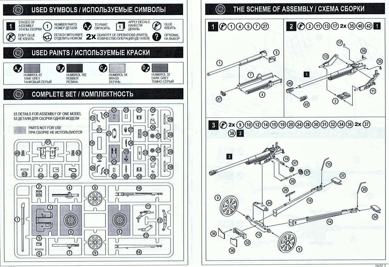 The instructions in the MW Pak 36(r) kit 7270 are very similar to the instructions for the F-22 kit 7269 and shows that it includes an additional sprue holding parts for the Pak 36(r): lower shield, 2-part muzzle brake (like ACE’s kit 72233), and recoil guard (part-46). Looking at the instructions we can see the different approach and design of the parts and assembly. The unused parts are shaded in gray.