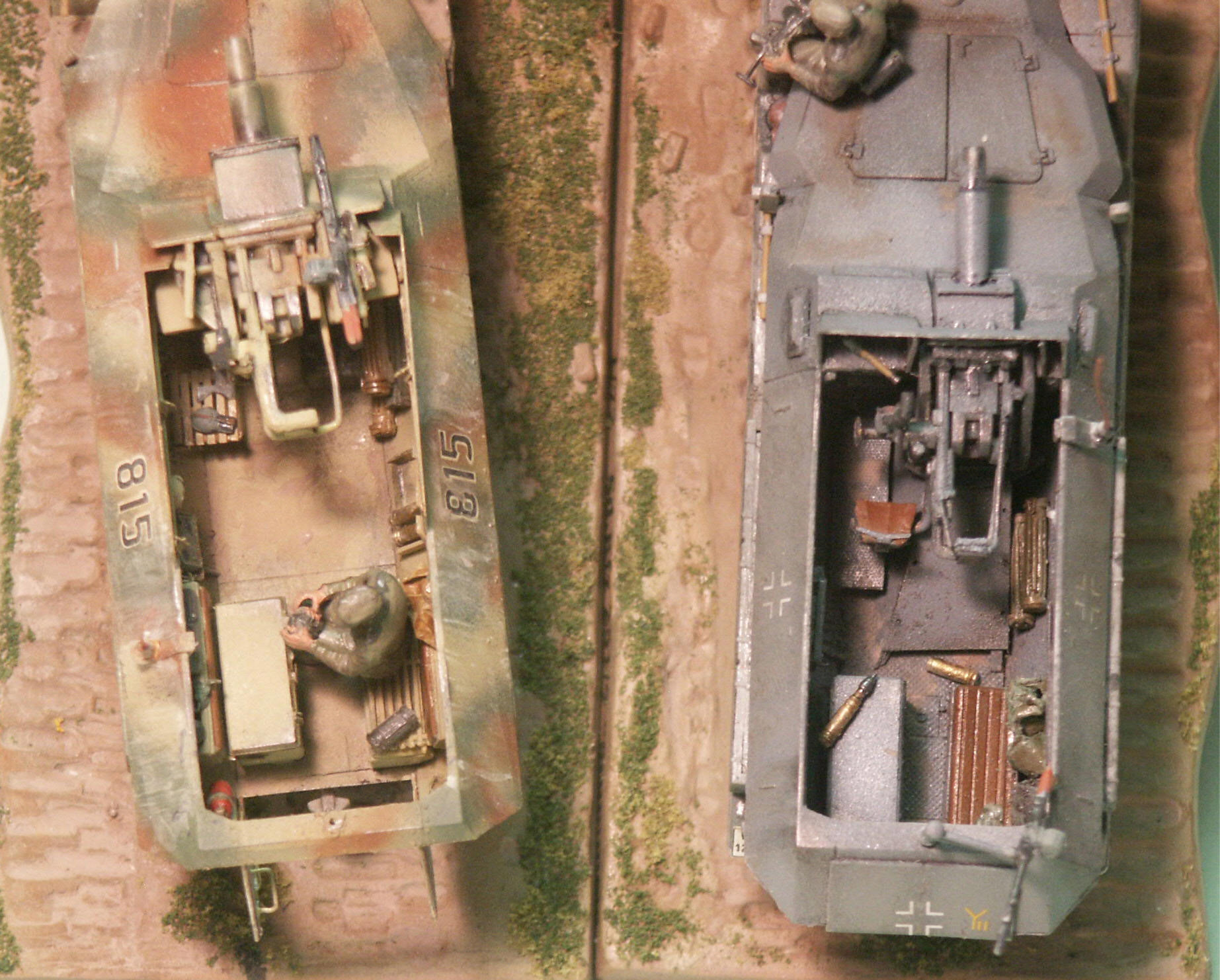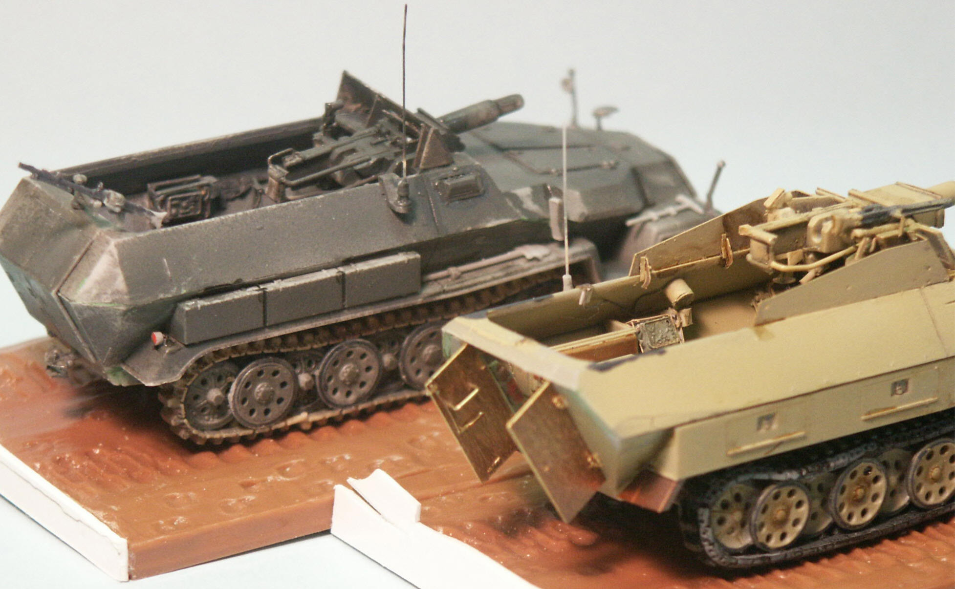 The two mostly completed Sd.Kfz. 251/9 models in 1/72 scale, still