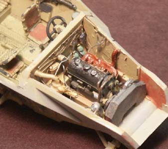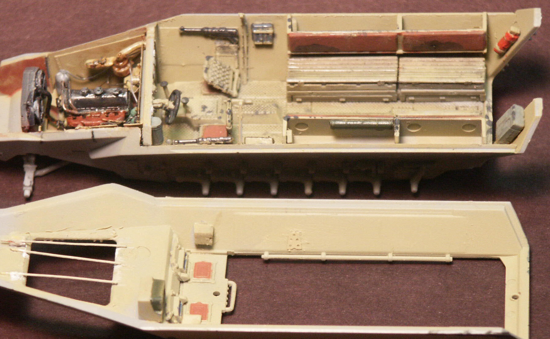 frets for the Hasegawa kits. b) Dragon Dragon’s interior has more parts and more accurate details. Here we see the wooden bench seats in the rear, crew MP40 submachineguns, the upper hull fittings with handrails, and the ExtraTech engine in the front. The bench seats correctly match the references and can be set in raised or lowered position. The spring texture on the back of the driver’s seats, for example, is beautiful. The padded backrests are done as brown leather. There are big ejector pin marks on the inside of the bins (backrests) that cannot be seen after the upper superstructure [part A6] is glued on. DML includes the important flanges [parts C9] present on the interior where the driver’s area bolts to the rear crew compartment. This view is of Hasegawa’s
