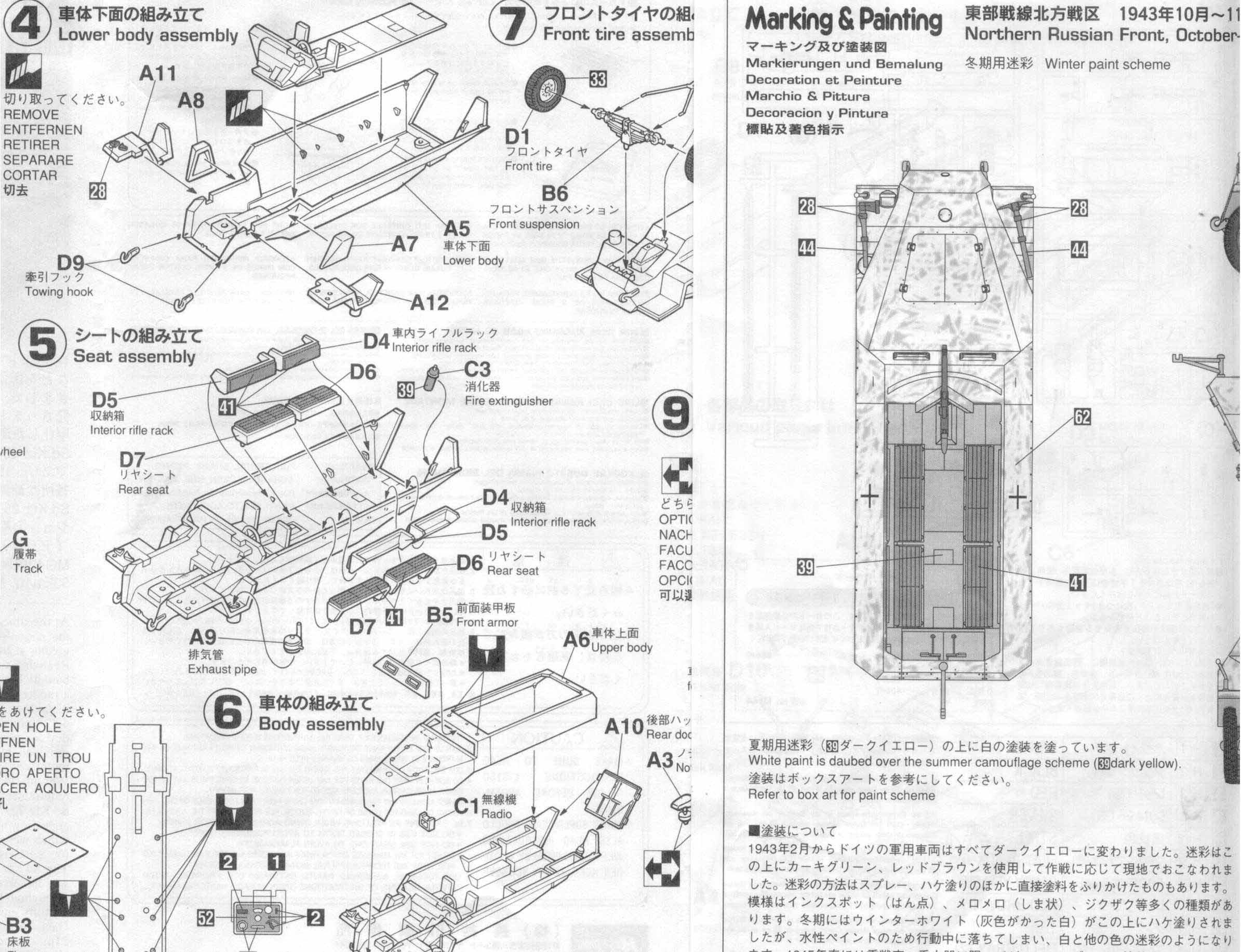 VI. Painting & Markings DML offers full color three view drawings for all their depicted vehicles, which is great. Many diagrams are of vehicles that appear based on single, rare black & white photos, so I would take the accuracy of the scheme and markings with skepticism. For example, many WW2 era vehicle photos show only two oblique sides at best, so knowing the markings and colors on all four sides is artist’s license. You do the best you can do, and who can prove you wrong? Except for Hasegawa’s color box art, their color & markings instructions are in black and white and are adequate. If you use Dragon’s color chart take note that they describe the base vehicle color H66/19 as RLM Sand Gelb 79 (a Luftwaffe color). From all my references I understand this should be Dunkelgelb nach Muster (later numbered RAL 7028) which is also a tan color. Dunkelgelb was used from February of 1943 till the war’s end in 1945. Sand Gelb RLM 79 was a darker and more tan color used in North Africa and the Sd.Kfz.251 Ausf.D was never used in Africa. As for the vehicle interior; prior to the February 1943 change, the interior of the Sd.Kfz.251 as well as the Sd.Kfz.250, was painted off-white in the forward driver’s area, and the exterior gray color aft of the flange holding the front to the rear. After the switch to Dunkelgelb [dark yellow] the driver’s area was the same panzer yellow as the rest of the vehicle. In the above Painting & Markings