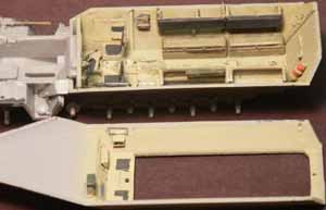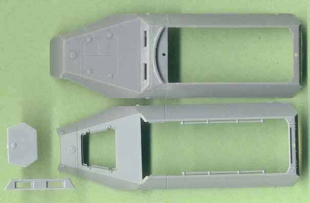 III. The Superstructure Parts At the top is the Hasegawa hull superstructure consisting of parts A6 and the front driver’s plate [B6] with open visors already glued in. Below Hasegawa's superstructure is the DML superstructure [part A1] in the slightly lighter gray styrene, also with separate front plate with open visors [part A18], and separate nose armor plate [part A13].