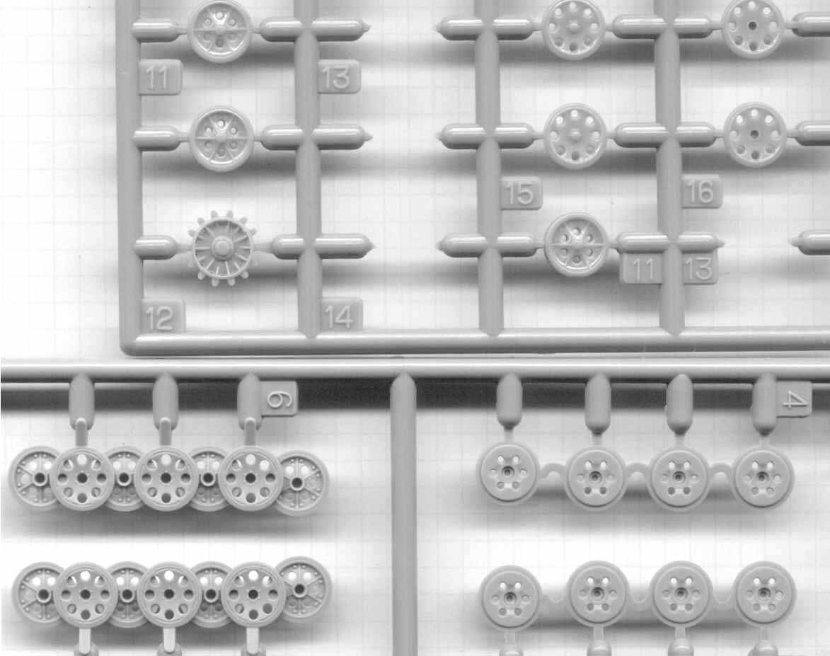 IV. The Suspension The Sd.Kfz.251 had interleaved roadwheels and rubber padded lubricated tracks common to most German halftracks of the time. In 1944 the Germans experimented and soon dropped the idea of steel padded tracks so as to save on scarce rubber. Both DML and Hasegawa have the correct 14 roadwheels; the rear roadwheel doubles as the idler wheel. Second from right are DML’s