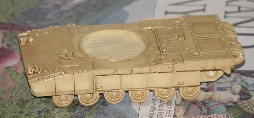 Highlights Highlighting a model involves two steps: the highlight coat of paint, and drybrushing. The highlight paint serves two purposes: it gets rid of unwanted wash stains, and it also weathers the vehicle. Use the same paint that you used for the base coat, but add some white to it. With the fine nozzle on the airbrush, carefully spray this lightened color onto all the open areas of the tank, like the glacis plate, turret roof, hatches, anywhere away from the nooks and crannies that have accumulated the wash. Pull the brush further away from the kit, and ever so lightly spray the lightened paint over the whole thing. This is difficult to explain, but it will make sense when you try it. The person who taught me this technique would buy two jars of the same color paint, and add a few drops of white to one of the jars, and use that jar for the highlights. I don't do this for two reasons. 1) I don't use enough paint to warrant two jars of each color. They'd go bad before I got around to using it all. 2) No matter how close the colors may look, it is possible to get colors that are ever so slightly different. Unless the jars came from the same batch of paint in the factory, this is always a risk. What I do is lighten the paint right in the airbrush cup. I add one or two drops of white and mix well. Don't add too much, or the colors won't match anymore, and don't add too little, or you won't be able to tell a difference from the base coat. Sometimes, you may want to repeat this process a couple of times, each time, lightening the paint a little more. The next step is the drybrush. The concept is to use some very light paint, either white, or a very lightened version of whatever the base color is on the tank. Get some on your brush, and then rub it off onto a rag or piece of paper, so that very little paint remains on the bristles of the brush and it is almost dry (hence the name "drybrushing"). Then lightly rub the brush bristles over all the bumps, edges, and high points on the kit, basically anything that would catch sunlight. The small amount of paint residue on the brush will highlight all the edges, making the model look more in scale. Again, I've been looking for the best method of doing this. Sometimes using acrylic paint works well, but other times, it seems that I get the best results by using an oil paint. Perhaps climate plays a part in this, and acrylics work best on very humid days. I'm not sure. Many armor builders I've met use pure white for drybrushing, but I think that tends to be too light. I instead use a very light gray. This is only for sharp edges, like along joints on the turret and hull edges, or any sharp, pointy protuberances. For rounded, softer, raised areas, like the mound-shape ventilator covers on Russian tanks, I use a very lightened shade of the camouflage color instead. You may want to repeat this step several times, using lighter shades each time.