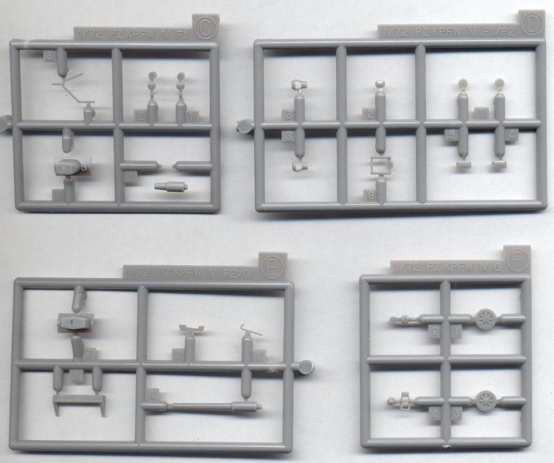 These are the sprues which are unique to each Panzer IV kit. Sprue C in the upper left comes with only the Ausf. F1. Sprue D in the upper right, comes with both the F1 and F2. Sprue E in the lower left comes with both the F2 and G kits. And sprue F in the lower right comes with the Ausf. G (two of them).