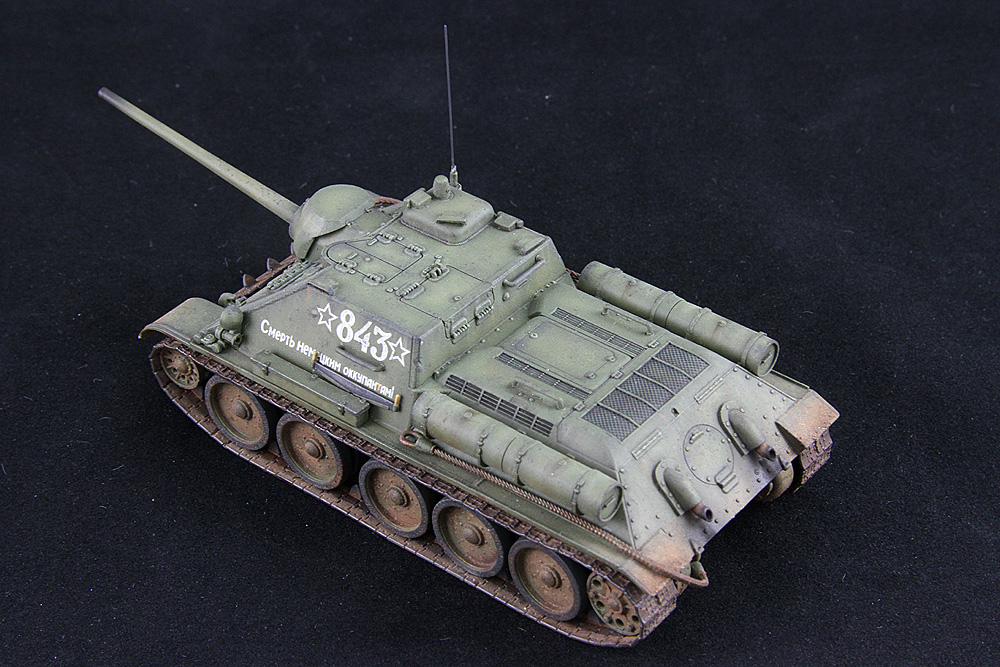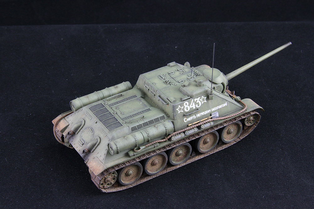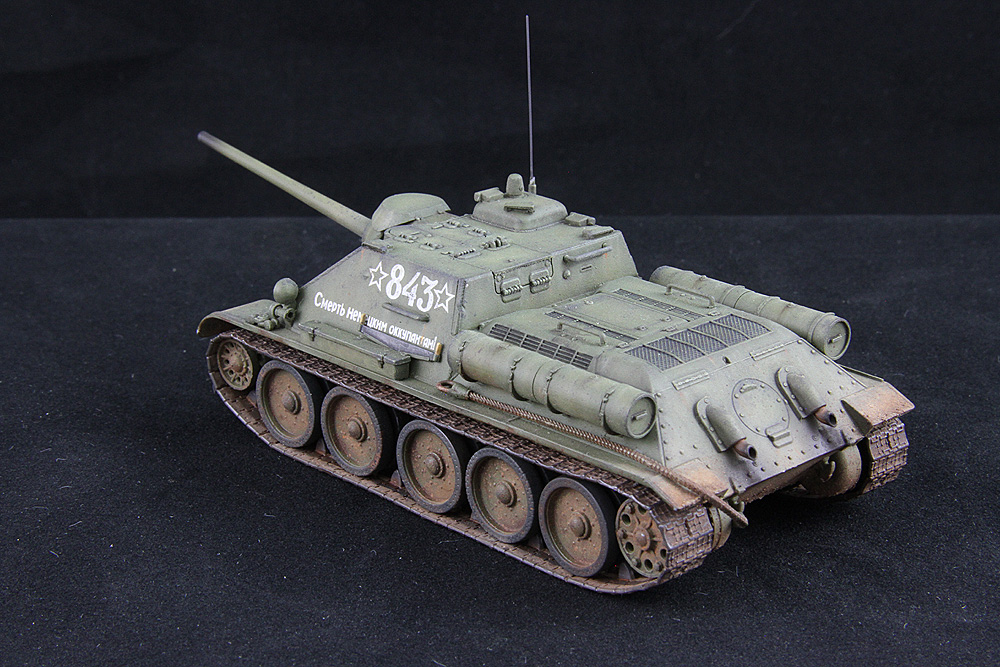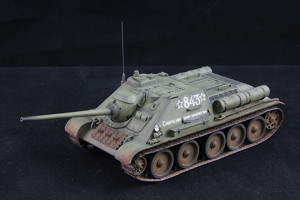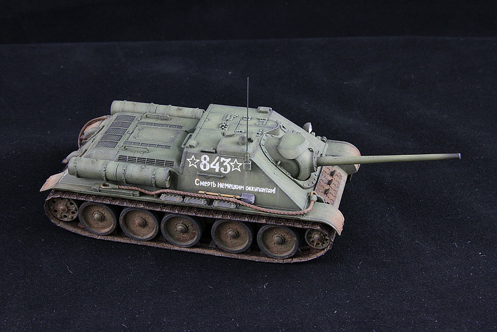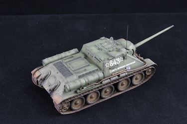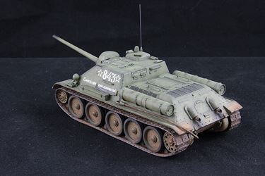 This is Zvezda’s 1/72 SU-85, built pretty much out of the box with the exception of the head light lens from Little Cars. The kit was generally a pleasure to build except for the one piece tracks, which were difficult to impart the curve around the idlers, were a very tight fit when installed, and did not align well with the locating pins on the centre road wheels.