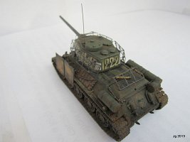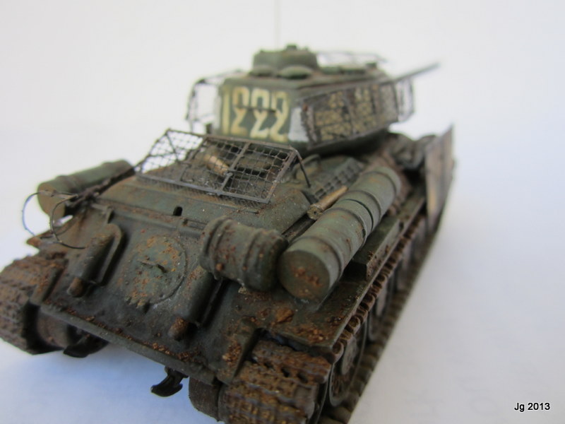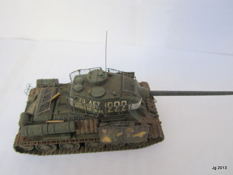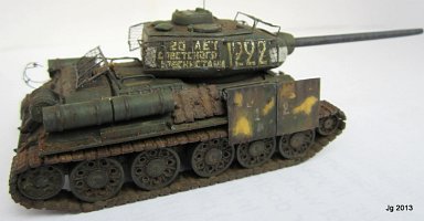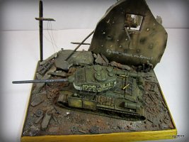 T-34/85 by the firm AER Moldova. This was a hand-me-down, and upon opening the box I was slightly nauseated by the lavender colored styrene. However, it did have link and length styrene tracks which made up for lack of accuracy in other places. Fit was good and it went together fast. I drilled out the wheels and fabricated a better gun barrel from sprue. I was going for the Berlin street fighting very late war vibe so I added "bedspring armor" made from altered 1/200 brass ship railing and wedding tulle mesh. Why not add additional salvaged schurtzen plate from a Panzer IV as this crew did not want to become panzerfaust fodder? These additions took much longer to make than the kit itself. Decals came with the kit and they are good and abundant. I had a field day weathering it and wanted the look of a tank just emerging from an intense battle.