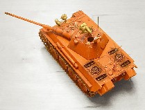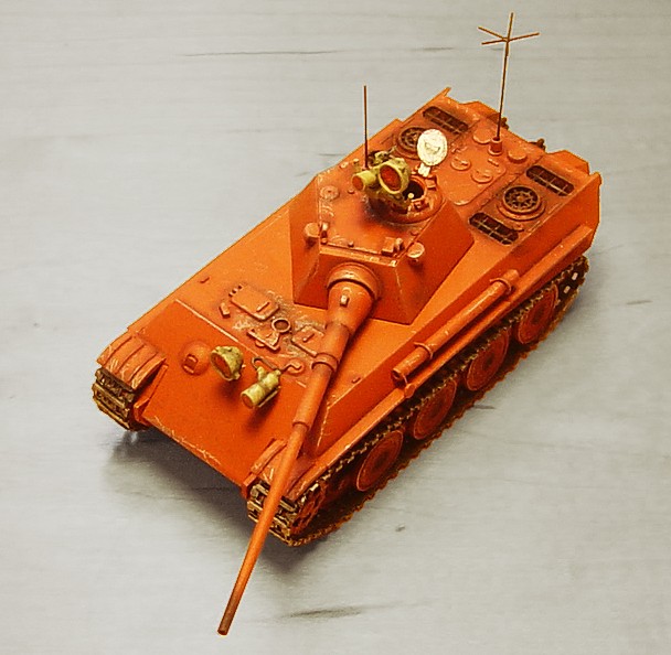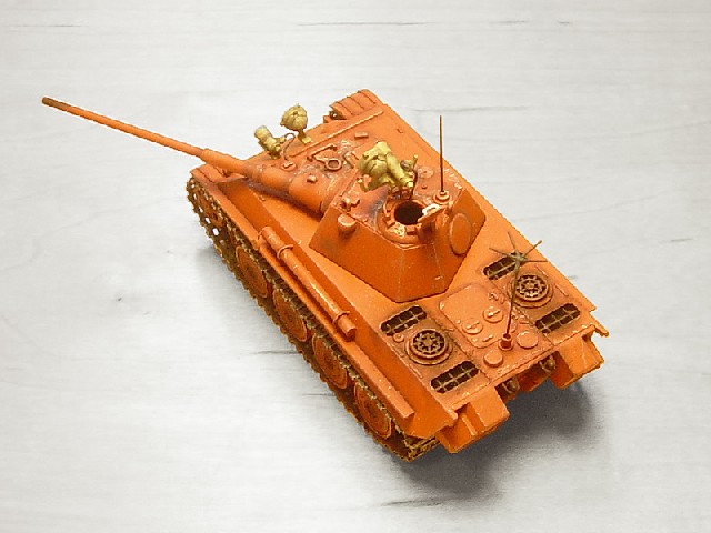 | The kit is the Hasegawa Panther II with a brass barrel that came with the kit. The IR equipment is scratchbuilt as is the crow's foot antenna and the antenna carrying tube on the hull side. Regular old spraypaint to mimic the red-oxide used at the end of the war. I weathered it with pastels and, for the first time, Prismacolor silver and steel colored pencils. |