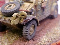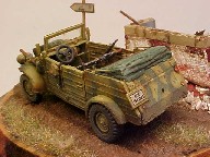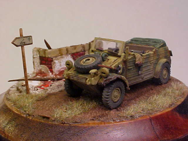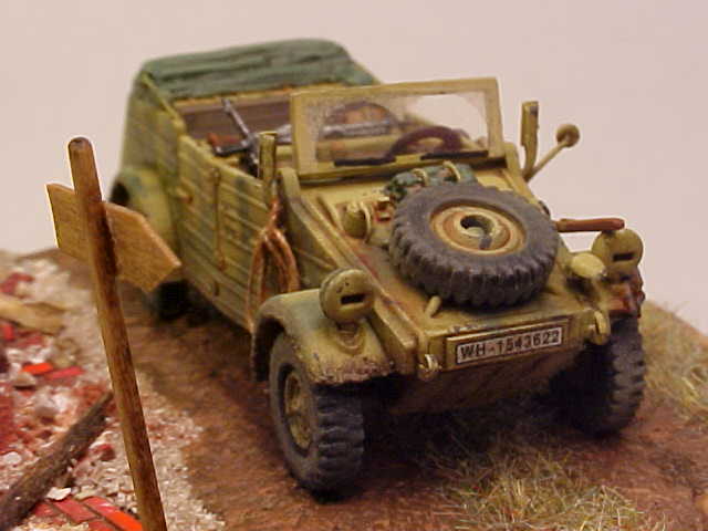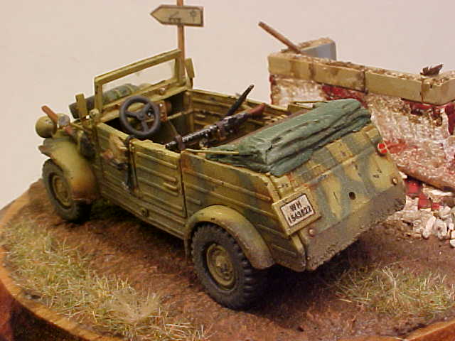 | Italeri 1/72 scale Kubelwagen. I detailed the interior with plastic, added the machinegun mount behind the front seats (the machinegun is from MMS) and the extra gear is from CMK. It was sprayed with Poly S paints and washed with oils. The soft cover is made from two part epoxy. The left front fender was replaced with lead foil and then damaged |