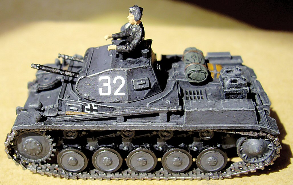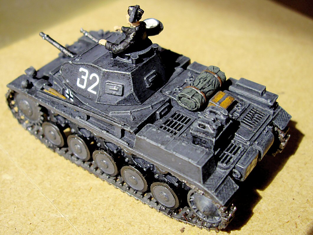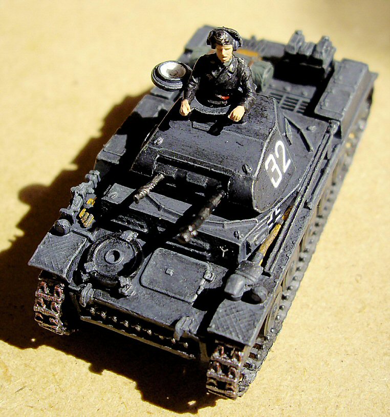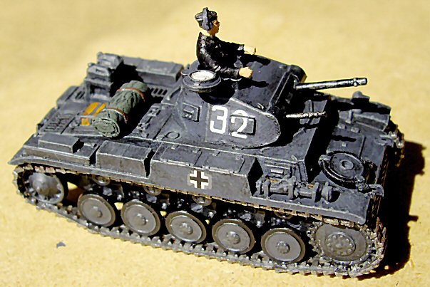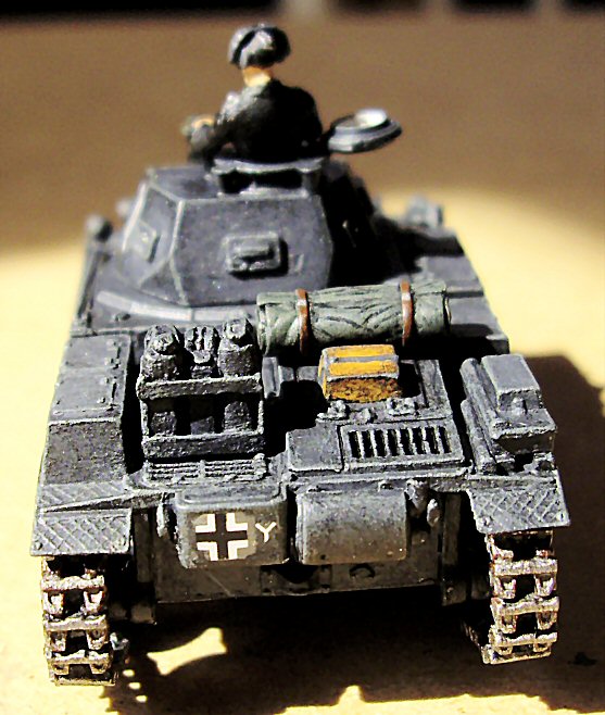 Tank commander is Preiser. Did some scratchbuilding as the clamps holding the spare wheel on glacis plate. Rolled Tarpaulin from CMK Tent Pack as I can remember. Rack with Jerry cans is from Modell Trans Accessory set for Panzer III