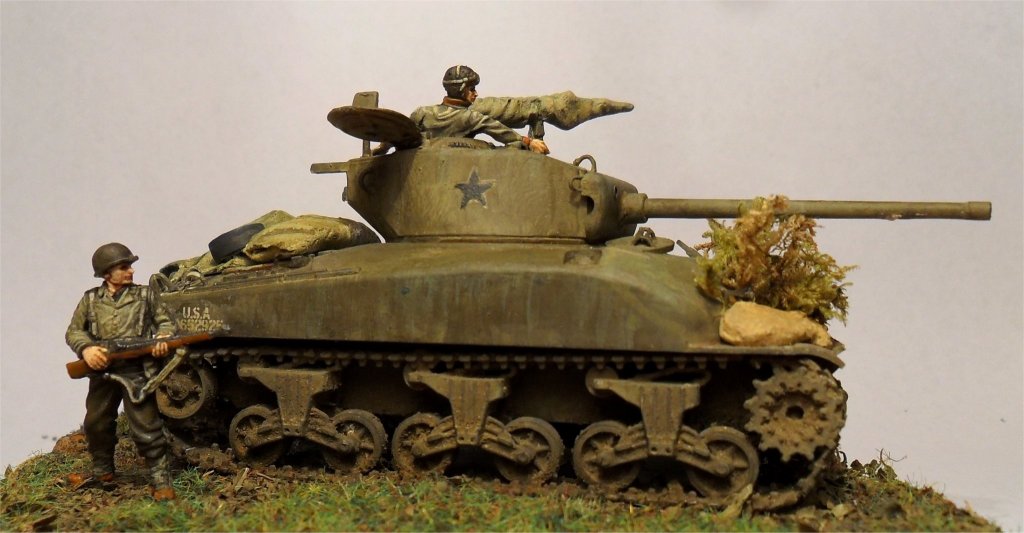 but it was the only one I had. The Italeri hull needs many small details to be added, like brush guards and handles, while the turret is missing the lifting hooks. I know there would have been much more to modify, but I decided to leave the rest as it is. Turret MG is unusable so I covered it with putty to make it look as if it was covered to protect it from dust. The tracks have no "duckbills", so it is not possible to replicate a vehicle used during the winter of '44 nor a vehicle with extensive sandbags protection (every pic of M4A1 76mm I have seen, taken after the fall of '44, shows track extenders in place). So, this is a vehicle fighting during late summer 1944. Extra stowage and sandbags were made from DAS pronto. Tank crewman and GI are from Italeri 6120 WW2 American Infantry. |