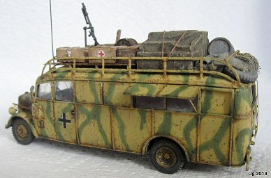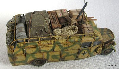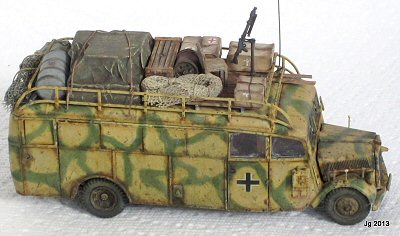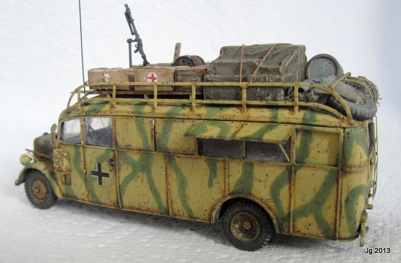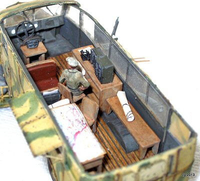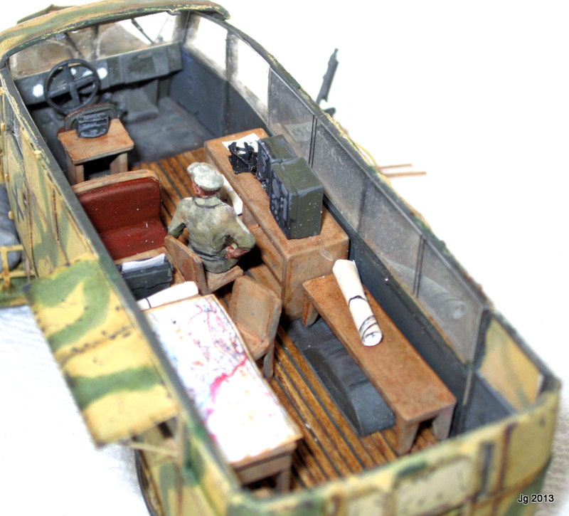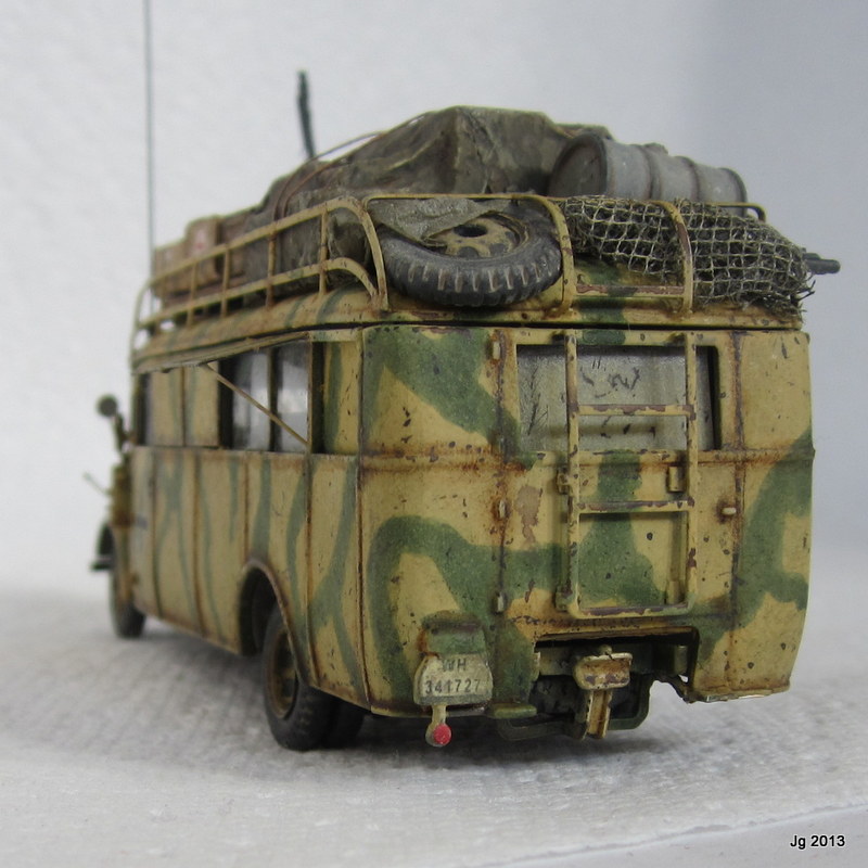 Overall a finely detailed kit but difficulties lie forward of the firewall where a fiddly, multi-part front end assembly makes proper alignment extremely trying. The interior and roof rack allow for super detailing if one wishes, I treated the interior moderately. I spent many hours just to build enough stowage to fill the luggage rack! The model was constructed with a removable roof as I wanted the interior to be accessible. Flooring of the interior is stained wood - HO scale lumber - as well as the roof's forward platform. I added the MG34 on an improvised mount as I felt the bus needed some defensive capability, and things just look better with a gun.