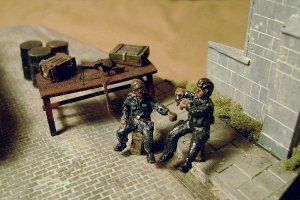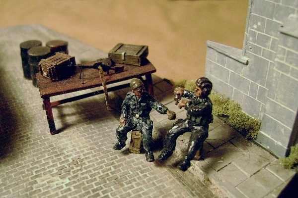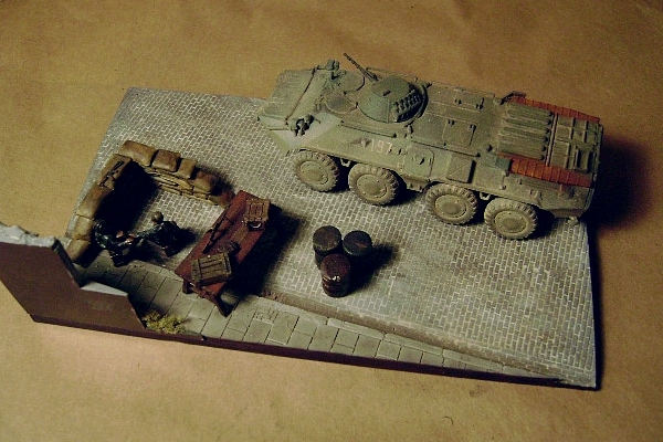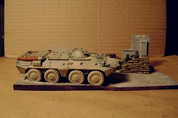 | This scene depicts a checkpoint during the Second Chechen War. Nathan used the Trumpeter BTR-80 built out of the box and painted to show all of the wear of a BTR close to being retired. The sandbags and oil drums are from an ESCI battle field set. The table is from MIG Productions. The PKM and AKSU-74 (on top of sandbag wall) are OKB Grigorov photo etch items. Base is from Astra and the crates and bag are Goffy pieces. The troops used are from Orion's Russian Federals. |