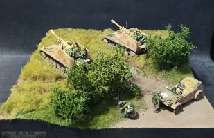 | This is my depiction of the counter-attack by the "Hitlerjugend" Division on Bretteville l'orgueilleuse, held by the Canadians in June 1944. The two self-propelled guns are from Esci, but the entire casemate was redone in plastic card. The howitzers are original Alby overmouldings, grafted with an Aber metal barrel and a "homemade" aluminum sliding rail. Finally, the tracks are from OKB. Figures are Caesar multi-poses. The section leader's Kubelwagen is an Academy with minor upgrades. |