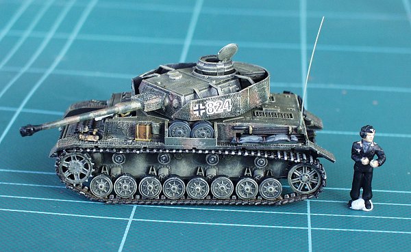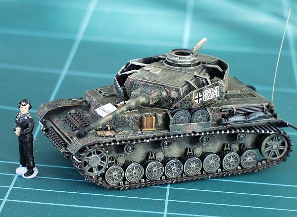 "I have tried to represent a Pz Kpfw IV Ausf. J on the Western Front in July 44. The zimmerite was engraved on with a Piro Graver, and the crew were taken from the ESCI Tiger II . The crew commander had his arms removed and new one's made from Duro with the left arm supported by a length of brass wire,and his head was turned to look to the left. The only add on to the kit was a rolled up tarpaulin on the rear mudguard."