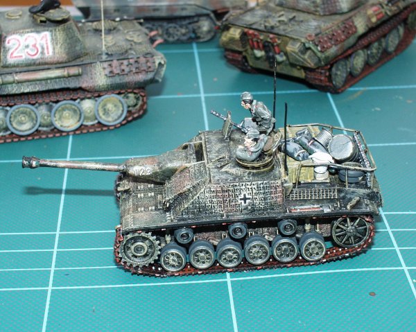 "The Stug III is the old ESCI kit given a coat of zimmerite, again using Duro. The gun manlet was converted by cutting down and filing the kit manlet and reshaping it . The crew are from Wargames Foundry which I believe they no longer produce."