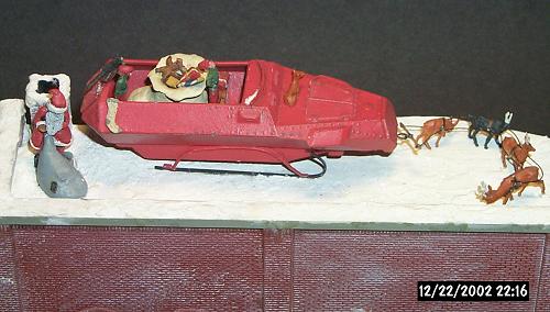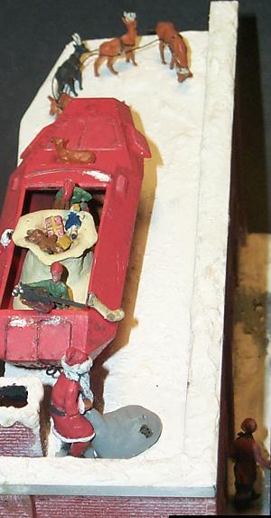 Like for the peoples of Asia, Europe and Africa, the war has been hard on Santa Claus. His original sleigh has been fragment-riddled over London and Burma by AA fire in 1940 and 1941, then finally to be abandoned as unrepairable. Santa has replaced his original wood sleigh with an armored Sd.Kfz 251 salvaged in the Ukraine and later modified and personalized by the elves. A 30-cal Browning manned by an elf has been added to help discourage night fighters and sentries, while another elf keeps a watchful eye.