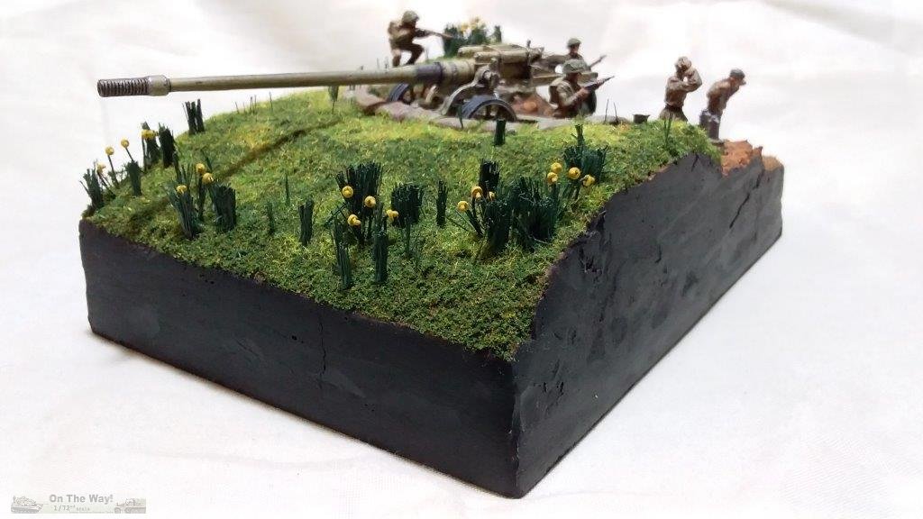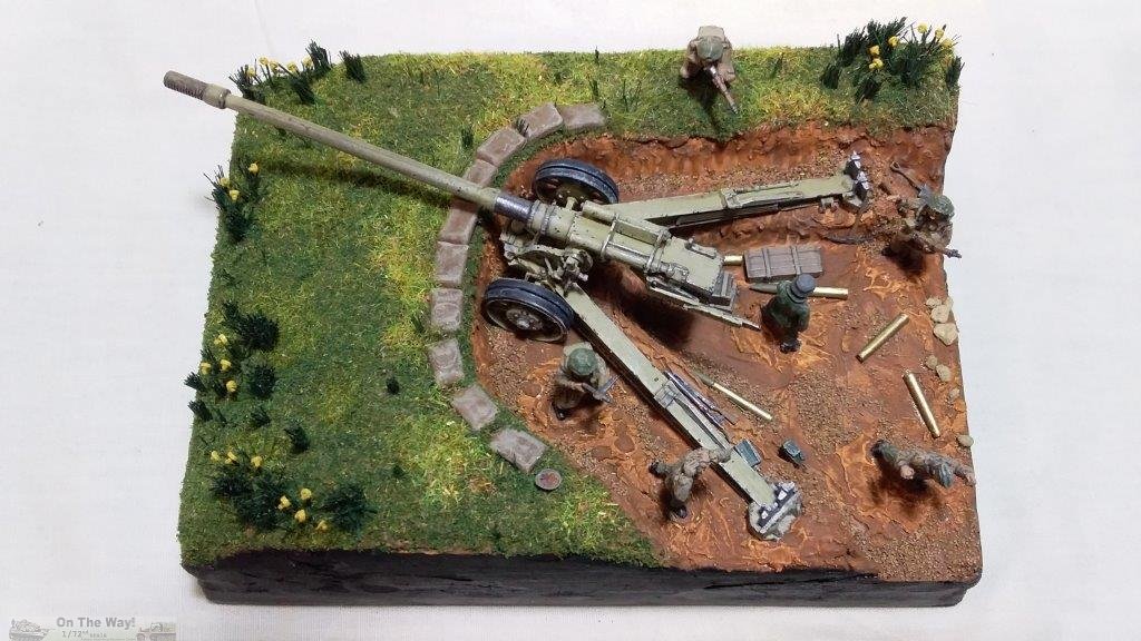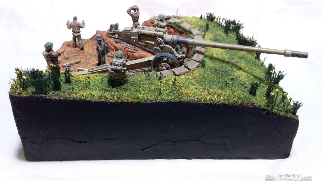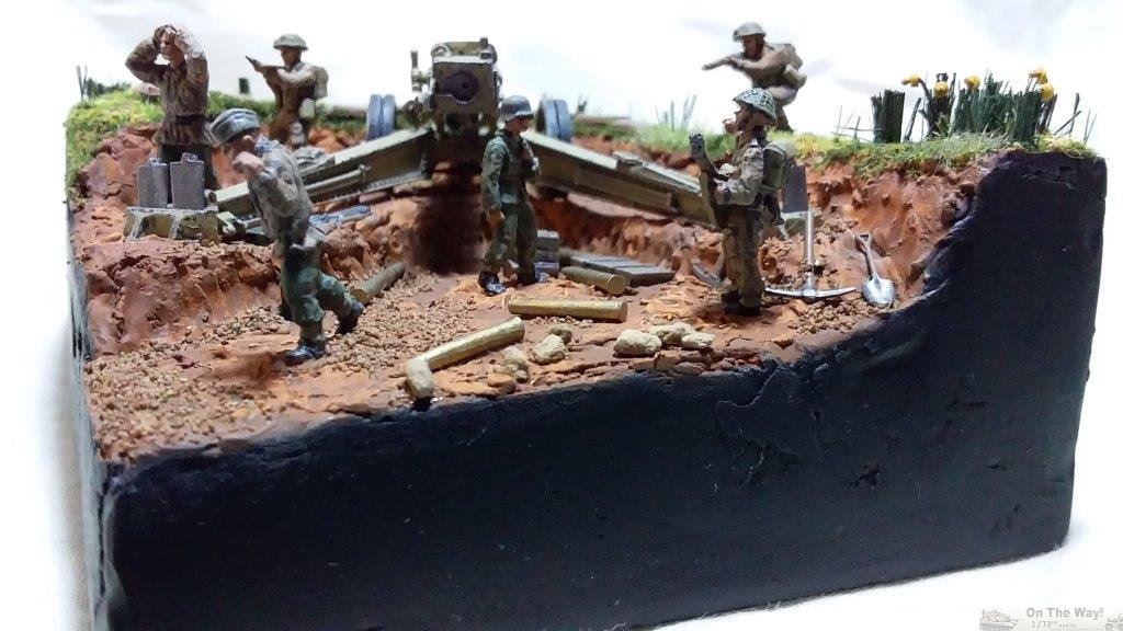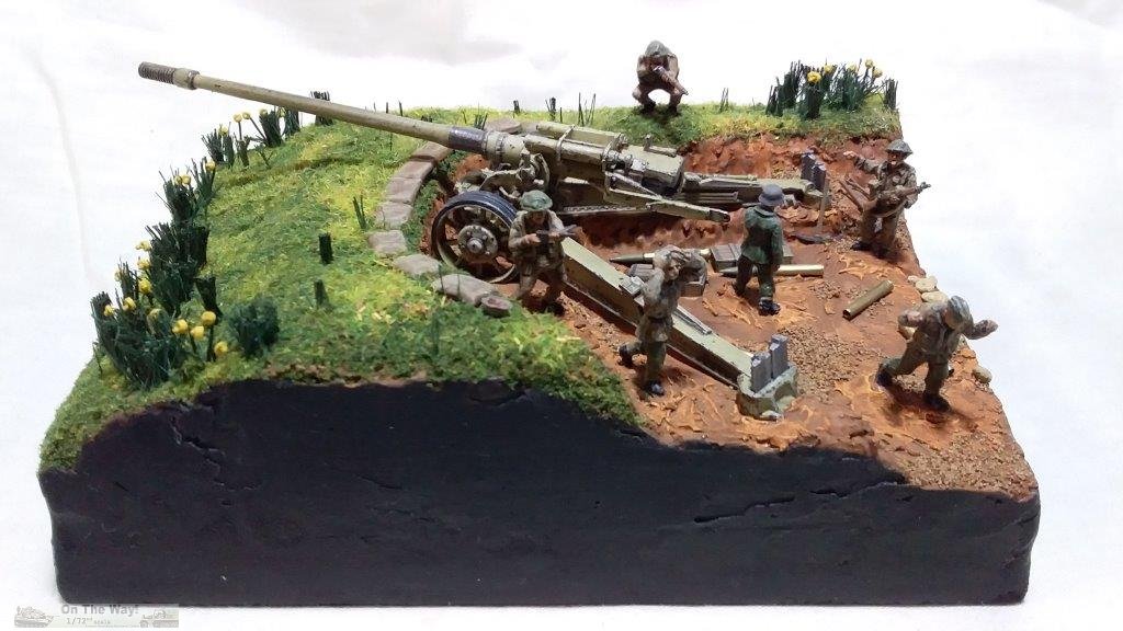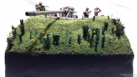 The Kanone 81/2 is by Ace with an AB miniatures crew (from a POW set). The British figure pointing his hand is from the same set, while the other two are by PSC. Ammunition for the real K81/2 was two part but came as one piece in the kit. I left it that way because I like the look of big shiny "bullets". I made the Daffodils from electrical wire and slices of plastic insulation stripped from the wire, with some shop bought "reeds" for the leaves. Other bits came from the spares box.