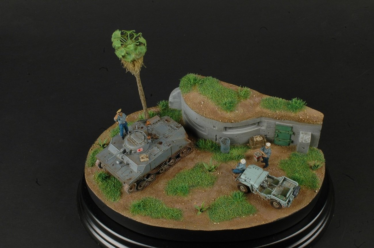 | Olivier used the Dragon Ka-mi and Jeep, with decals from an old Academy GMC. The US Navy sailors are from Hecker & Goros. The bunker is from Italeri. |