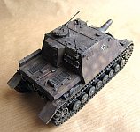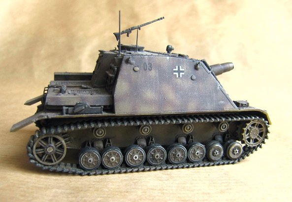 The French firm Al.By makes an excellent partial resin kit of a late type Brummbär with a wide front wall. The cast is extremely detailed and crisp - for instance two delicate handles are cast as one piece with the hull. The product has been marketed alongside with an old ESCI Panzer IV kit as a combi-kit. ESCI sprues are supposed to contribute the lower hull, ground wheels, tracks and miscellaneous small parts to the model. Four pairs of steel wheels, two-spoked idler wheels and sprocket wheels are included in the Al.By resin parts. I did not accept the quality of the ESCI kit and decided to replace all of it with the new Revell Panzer IV Ausf. H parts. As the dimensions of these kits are different, this decision required that the Revell hull be lengthened with strips of plastic, 2mm in front of the rear idler wheels. Also for fitting reasons the original error with the ESCI kit had to be reproduced by adding some height to the Revell lower hull. The detail level of the kit was brought up with this kit-bash, but the price that had to be paid is that the idler wheels are now situated too far back and the lower hull is a bit too high. Overlooking these flaws, the model looks very good finished, especially when it is completed with items on the hull deck, mainly confiscated from the Revell kit. Some metal wire applications (hull hooks, spare wheel racks, cupola MG mount) and other small self made parts (sighting periscope, spare track holders, bow MG, antenna) were added, as well. Schürtzen-plates were standard installations on late Brummbärs, but they are left off this kit because of the lack of appropriate hangers and to show more of the vehicles sides. Some track sag would have been a nice effect, though.