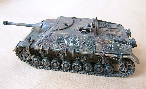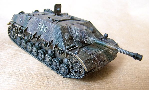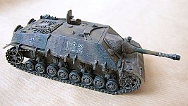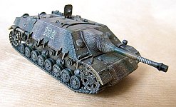 This is an early Jagdpanzer IV by Hasegawa. Poor original vinyl tracks were replaced with hard plastic tracks taken from the Revell Pz. IV kit. The sprocket and idler wheels were changed at the same time. Some smaller details (handles, periscope covers) were also added and some hole drilling done. The zimmerit coating is pressed with a small screw-driver on the plastic surface softened with liquid glue. The kit was a joy to build with zero problems and it looks very nice finished.
