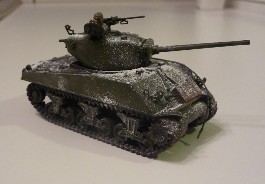 Dragon US M4A3 76 MM Sherman in the Ardennes. Snow was fashioned from Tamiya's pastel set.