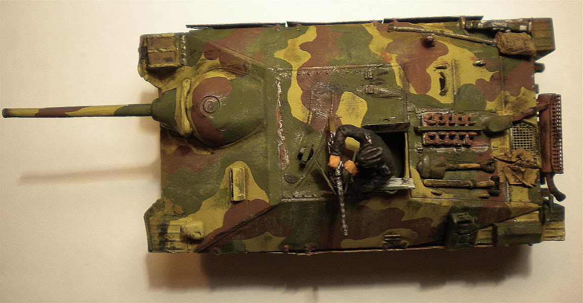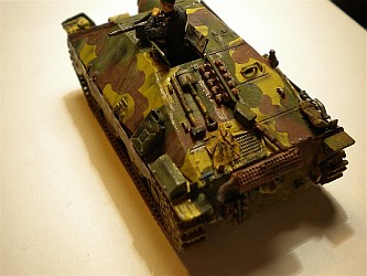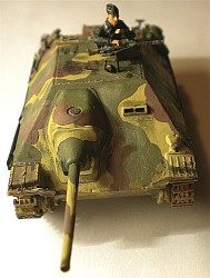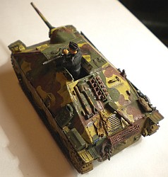 | This is the UM Hetzer, early production model, with a fair amount of detailing and reworking. Markings are for PzJäger Btn 1553, Operation Nordwind, January 1945. |