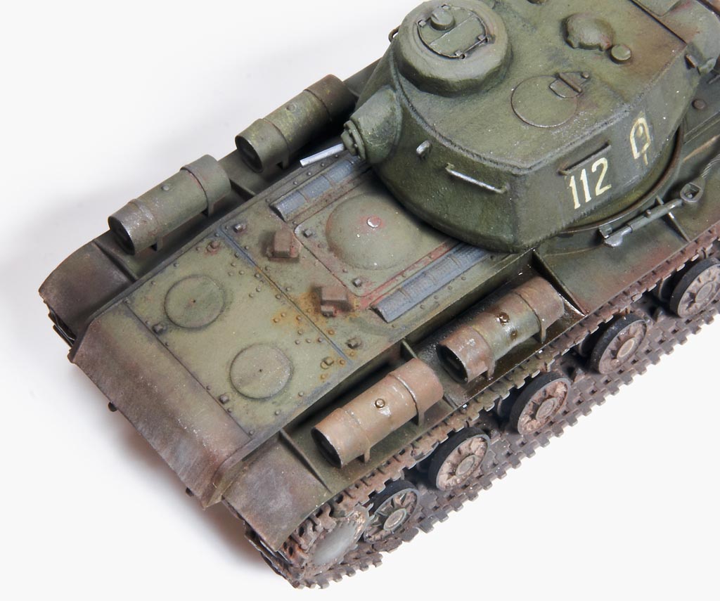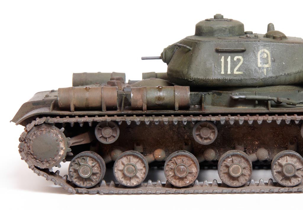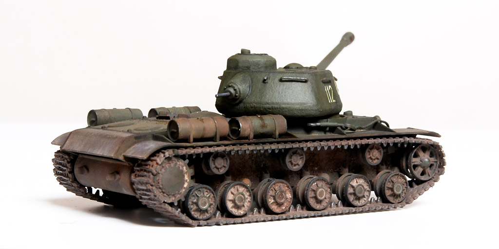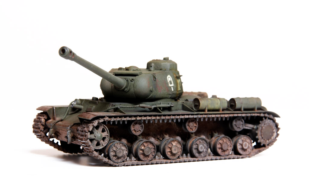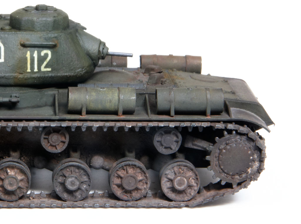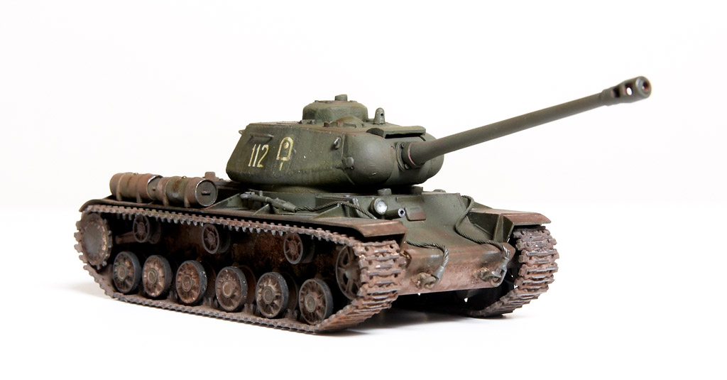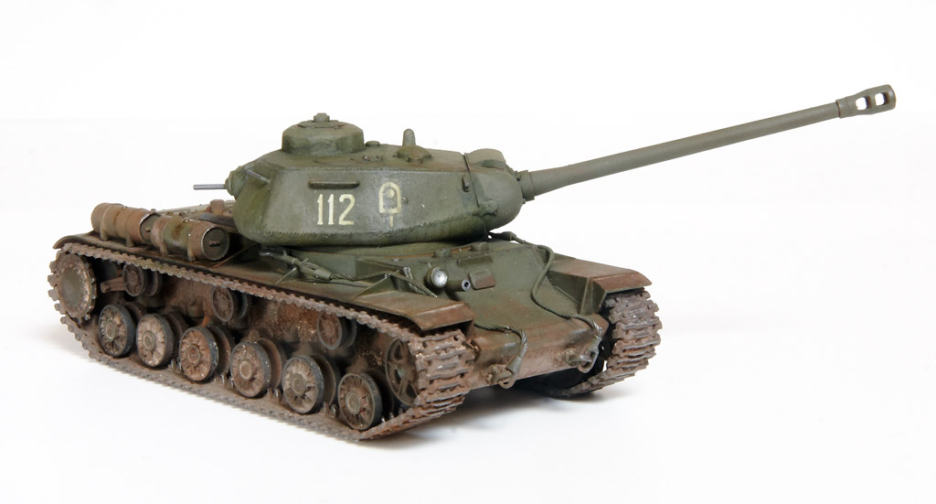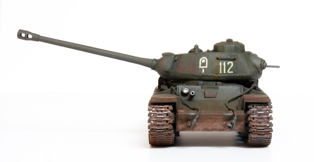 The kit handrails were replaced by wire, gun barrels drilled out and the main gun replaced by the Aber 122mm D-25T (72L-04). The tow cables are by Eureka. After grey primer, the base undercoat was a mix of Citadel Dark Flesh (to replicate Red Primer) and Tamiya Nato Black in different sections. The base coat was a mix of Tamiya XF61 + XF65 at a 2:1 ratio. This was then covered with AK Light Chipping Fluid so that I could reveal small sections of the Red Primer undercoat, etc., although some sections then disappeared under the weathering process. Some fuel stains and spillage added with AK Fuel Stains. I attempted some cast texture on the turret and the weld seams using Mr. Surfacer. Various Mig Mud Pigments were also applied. This kit was a joy to build as it went together very well, with minimal clean-up. |