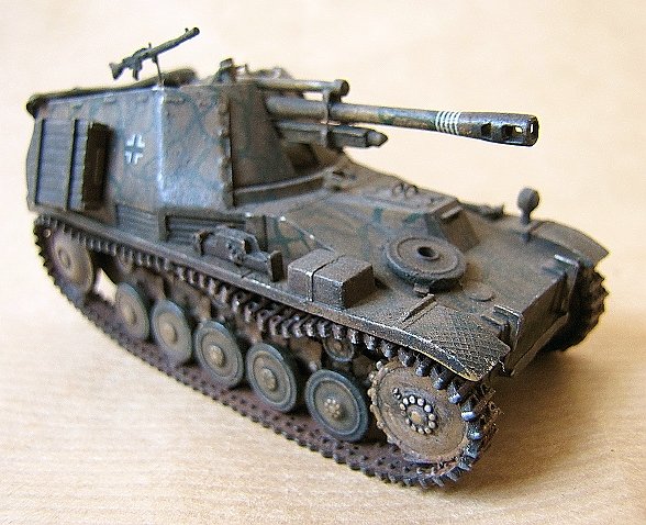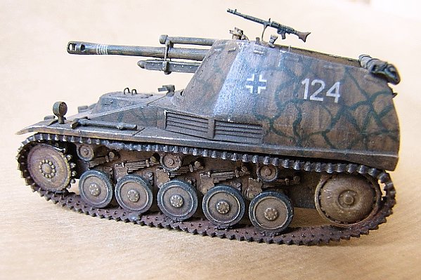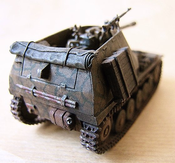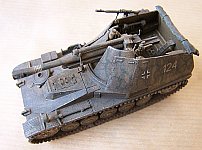 This is a "Wespe" self-propelled howitzer based on the old ESCI kit. It is a bit bulky and simplified kit and in my opinion it required the fighting compartment walls to be replaced by thinner material, the interior and the gun (including e.g. muzzle brake, cradle, sighting device) to be detailed and the equipment on the outside to be altered and complemented a bit. Further detailing could have been possible, but I was satisfied with the aforementioned alterations. I only remain sorry about the rather poor and almost completely glue resistant vinyl tracks. Special thanks to David O´Barr for providing the kit and to Bram Corts for information on the subject.