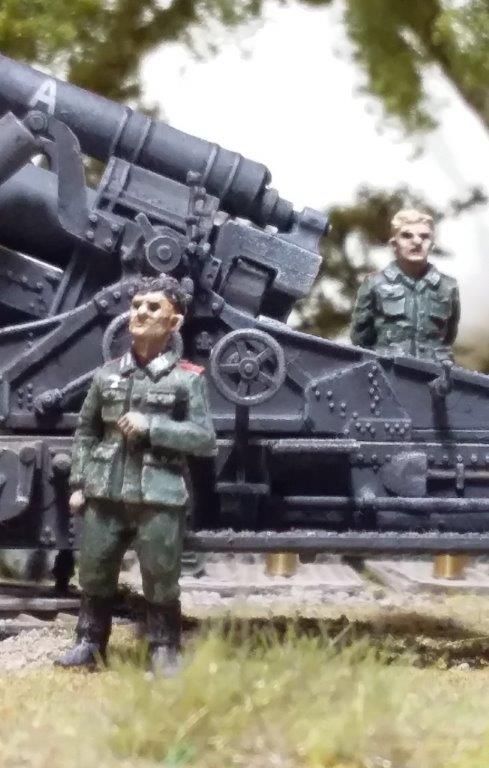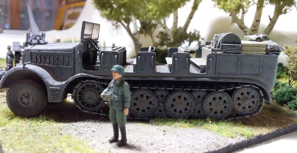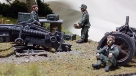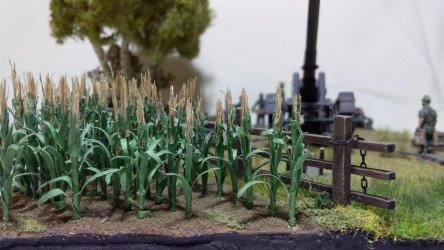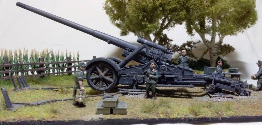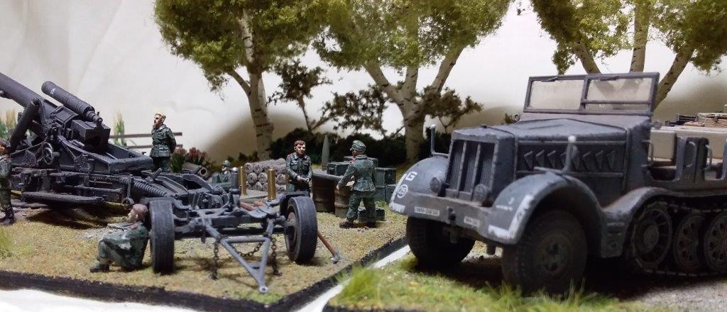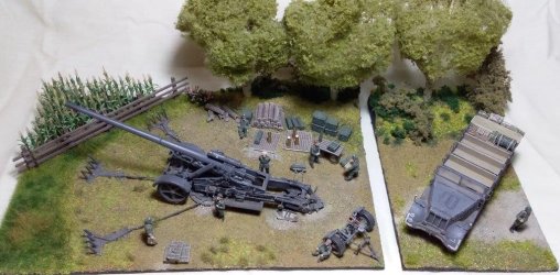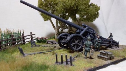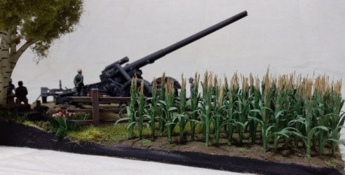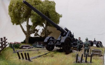 | Here's a diorama I call "The Scarecrow". I used the Revell Kanone 18 170mm Gun and sdkfz 9 Famo kit. The famo with the CMK artillery prime mover conversion kit is the same one already in the gallery. It was supposed to go on the base with the gun but there wasn't enough room. All the figures are by AB Miniatures, most of them are from a POW set. I ordered the MR Modellbau upgrade and accessory set as an afterthought to get some ammo for the gun, therefore it was too late to use the resin wheels and turned aluminium gun barrel. Most of the scenic material is by Woodland Scenics, but not sure of the maker of the corn plants. Monty's caravan (Matchbox) kindly donated the little table made of oil drums and corrugated iron, and the fence is balsawood. Other bits and pieces came from the good ol' spares box. |