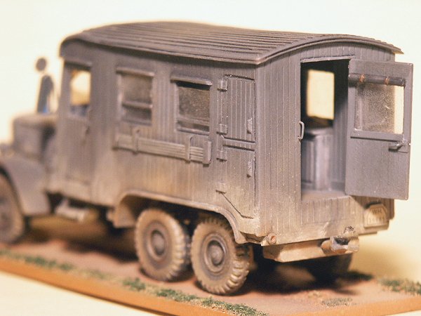 | Assembly went pretty well and it looks fairly accurate. No interior detail on walls but does include desk and cabinets. No radio, antenna or other assesories. Clean-up was easy. The rear door was too short and had to be lengthened. The model is noticeably longer and wider than the MAC Distribution/ZV Models kit of the uniform diesel. At 88-mm long the model scales out at 1/66 scale (based on a vehicle length of 5850-mm) which seems odd. |