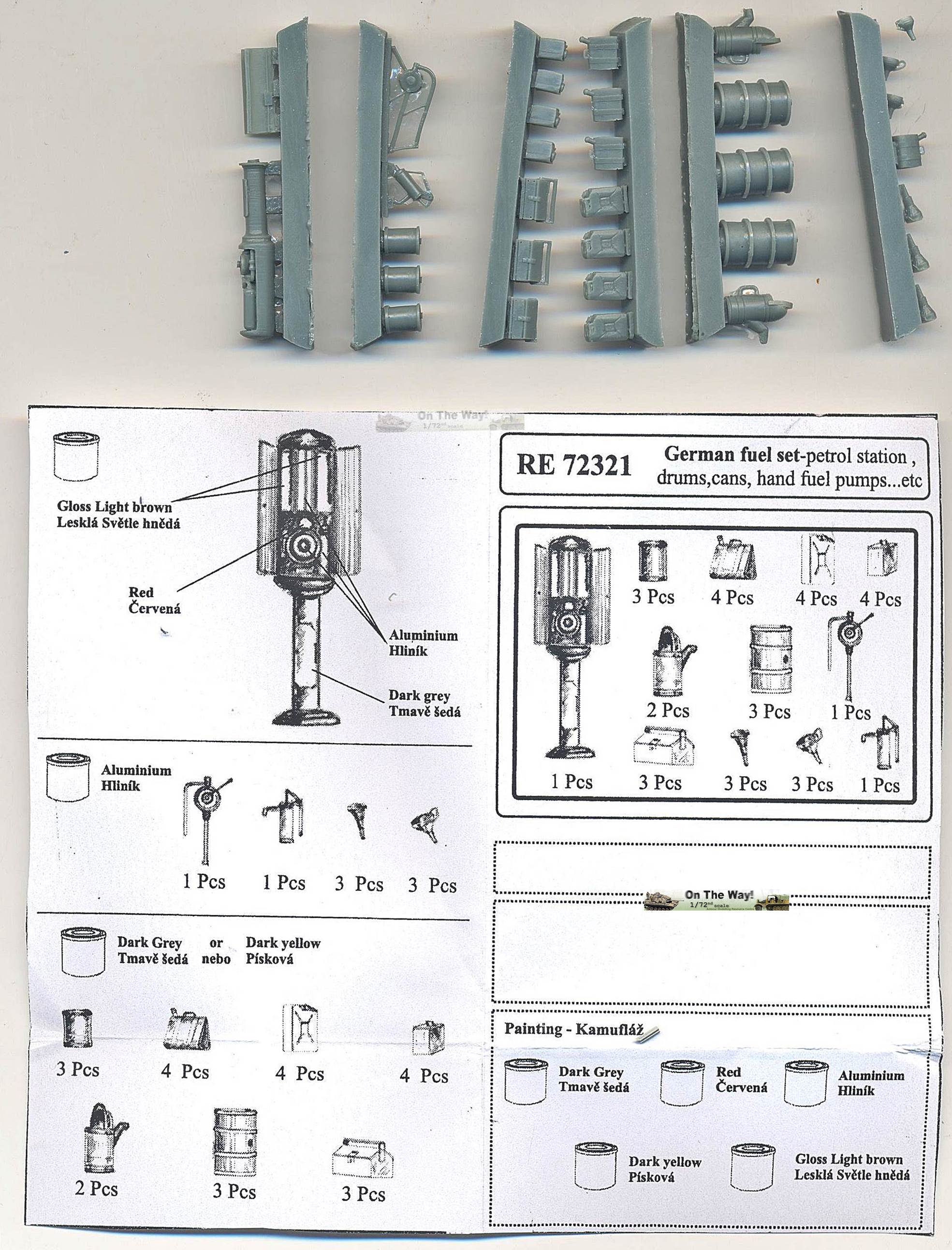 | 72321 | German Fueling Supplies | WW2 style. Petrol station, German/British style jerrycans (with nicely done handles), early war German triangular fuel containers, small round tins, British "flimsies", large and small fuel/oil cans with spout, large oil drums, hand pump, toolboxes, two types of funnels. All nicely done and useful for a diorama. The label staes "German fuel set", but I am sure it can be used elsewhere, as the "flimsies" already indicate.- R. Haelterman | Picture | ||