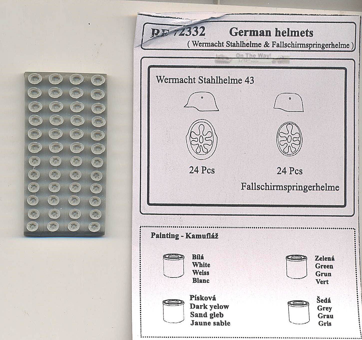 | 72332 | German Helmets | 24 Wehrmacht Stahlhelme 43 and 24 Fallschirmspringerhelme. Beautifully sculpted, with realistic inner liner. Admittedly a bit on the large size, scaling out at size 72, while real sizes went from 60 to 70, 64 being typical. - R. Haelterman | Picture | ||