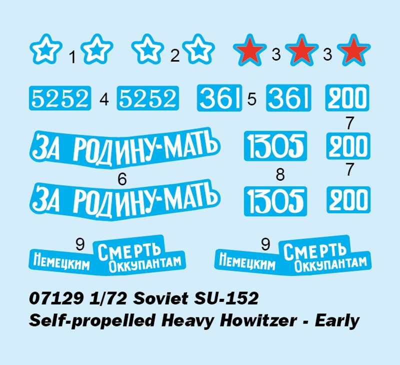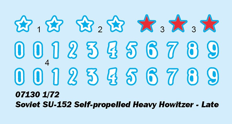 | 07130 | SU-152 late | The main difference between kit 07129 and 07130 surrounds the presence of the vents. The 07129 does not have vents while 07130 does. Regarding the decals for kit 07130: