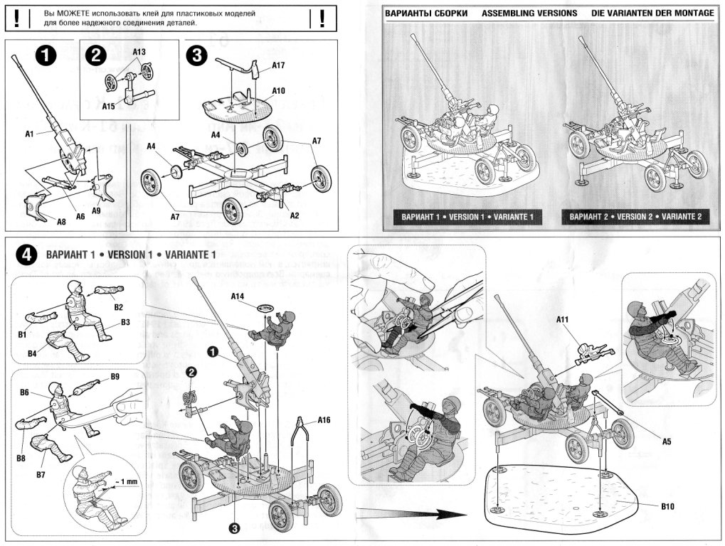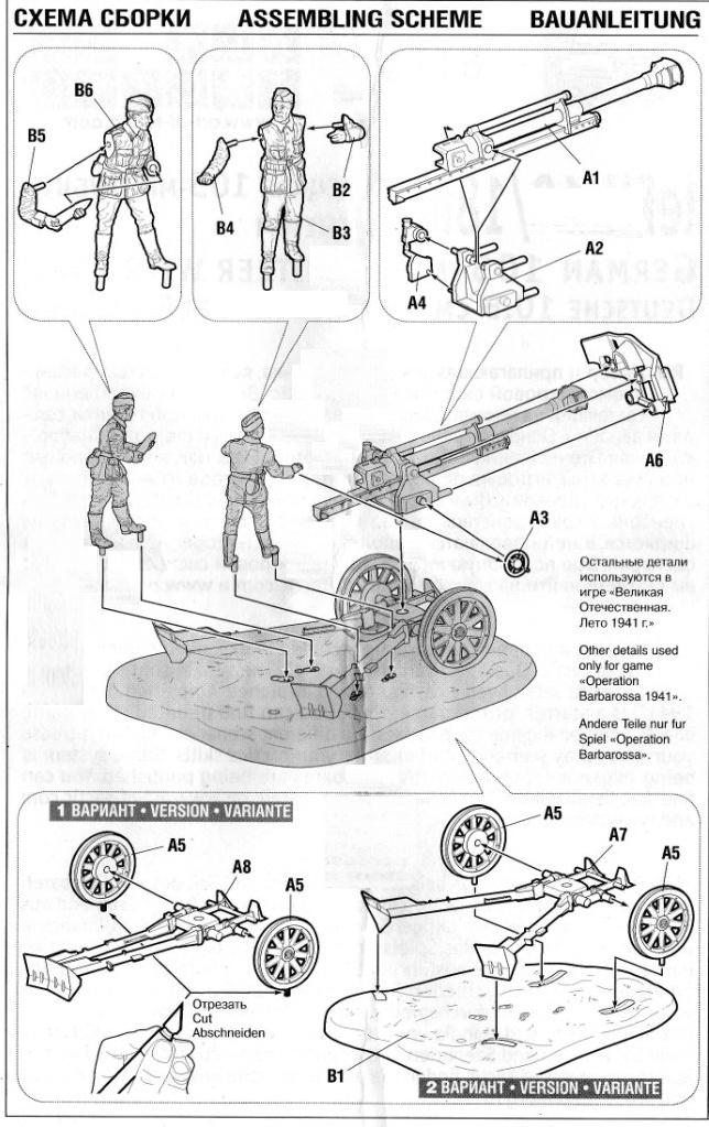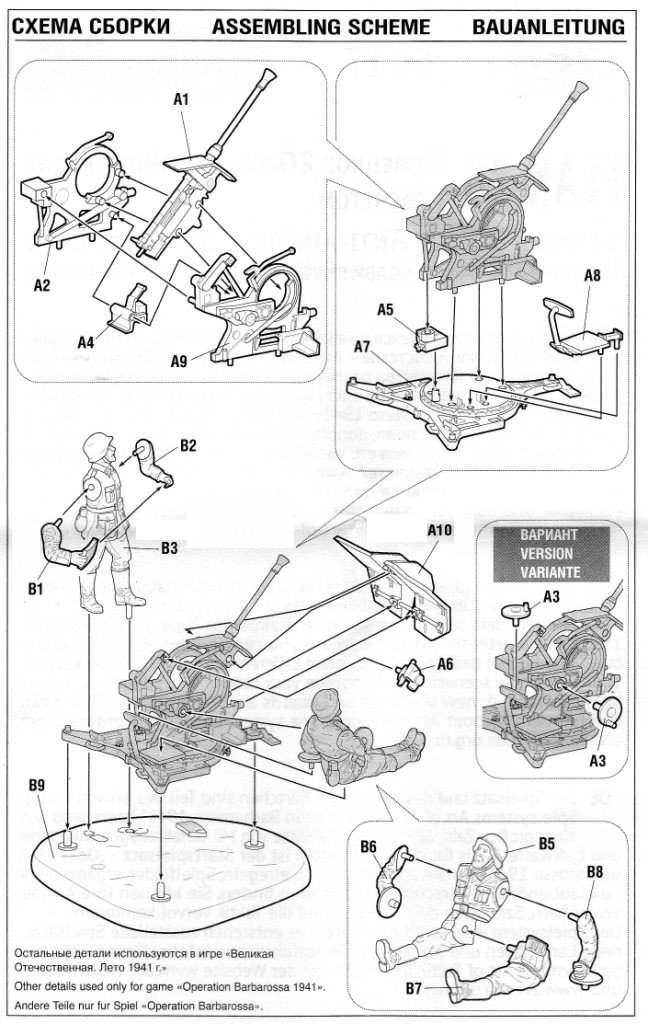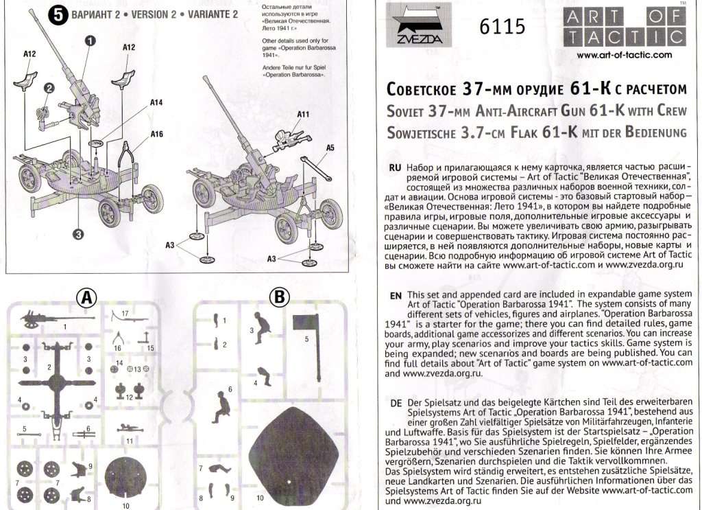 | 6115 | Soviet 37mm AA Gun 61-K with Crew | Molded in "semi-hard plastic", which isn't as hard as "normal" kits but harder than the Revell leFH 18 or Italeri's Zis-3 and PaK 40. The cannon is pretty well made, no sinkmarks whatsoever and it can be assembled with or without gun crew. - Victor Hugo Peña | Instruction Sheet pg.1 | Bill Powers | |