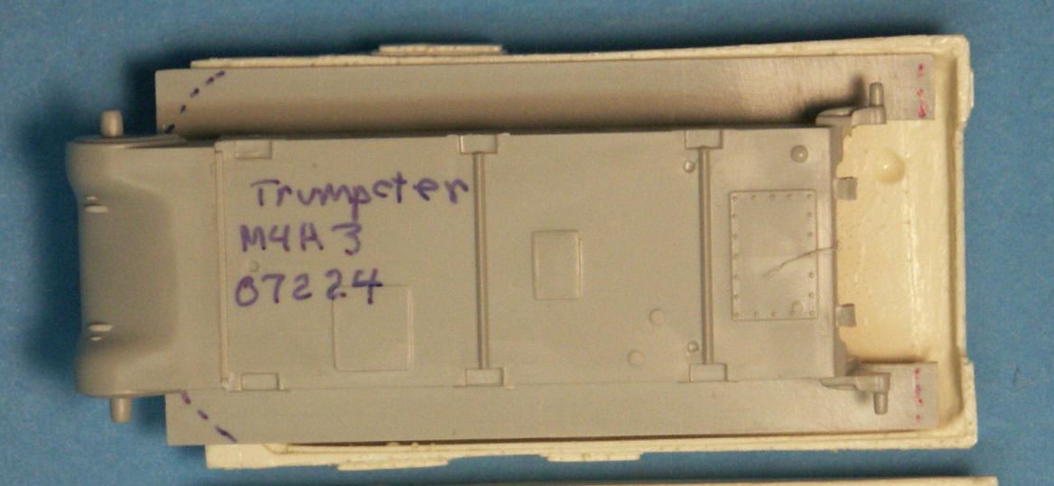 To use an M4 or M4A3 lower hull with the 72nd Brigade upper hull we’ll have to trim off the front corners of the sponson, and perhaps some off the rear. An M4A1 lower hull should drop right in with little trimming. This photo has the 72nd Brigade M4 composite hull with the Trumpeter M4A3 kit. Remember, the M4 Composite/Hybrid was produced with the mid-late war one-piece wedge shaped differential cover so we’ll have to use a mid to late war production M4A1 or M4A3 model donor kit.