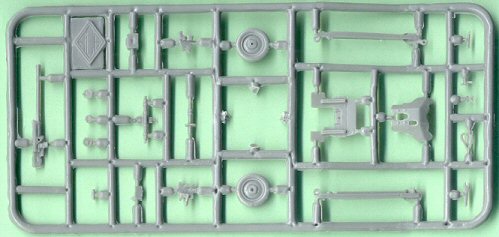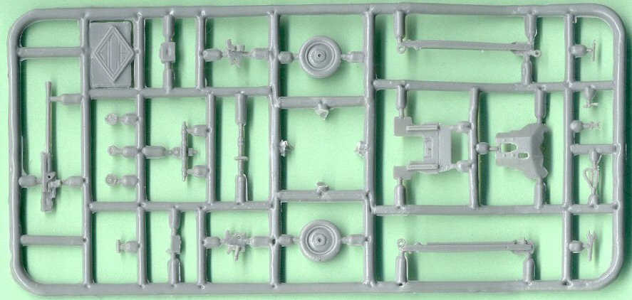 On the far left side of the sprue is the one piece gun barrel, recoil system and breach (part-1). Because of the scale and nature of the plastic and molding, the gun barrel is a little thick for the scale and we could replace it with a piece of brass rod. Remember to reattach the flash suppressor if you do. To the left we see the back of the gun shield (part-14) with two long vertical boxes; these boxes I have not yet found in my reference photos. I noted some flash around part-18, the gunner's recoil guard. For a nice display model you might wish to scratch build this recoil guard out of fine brass wire. Some
