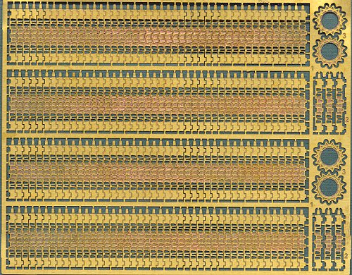 It seems that etched tracks are becoming all the rage these days. There's no question that the tracks included in the ACE T-54/55 series of kits could use a little help, and ACE has now given us an alternative. Enough track is included to do one tank model, plus a couple of spare links for stowage. Also notice the replacement sprockets, which will also be a great improvement over the kit's plastic parts. My only question about these, is whether or not they will be too thin when built. But I had this same concern with the PART Panzer IV tracks, and they actually look fantastic, so I'm hopeful that these will also. Notice how there are some segments of tracks, about five links long, in each strip where the inner surfaces have no connection to the adjacent links. I assume this is for making it easier to wrap around the sprockets and idlers. This looks like a great set, and I am anxious to see them in action. Thank you to ACE Models for providing the review sample. |