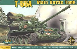 ACE has graced the modeling community with several versions of this most ubiquitous main battle tank. I previously wrote a preview of the first kit released, the T-55, which is still mostly valid today. But with more research on my part, and several revisions to the base kit, it warrants a new preview article. This current kit is the T-55A, which is basically the same as the T-55, but with added NBC (Nuclear/Biological/Chemical) protection added to the tank. This additional protection is visible to the modeler as altered crew hatches, both on the turret, and the driver's position. Also, most T-55As were retrofitted with the 12.7mm AA machinegun common on the earlier T-54. This kit is primarily the same as the earlier T-55, with some minor additions. First of all, the wheel and track sprues of the original kit have been revised since I built my earlier review kit years ago. Pictured below are the two new sprues, one for the wheels, and one for the tracks. These new wheels and tracks are now included in all of the ACE T-54/55 series of models. The turret and hull sprues are the same in this kit as the previous T-55 kit. One thing I would like to note, however, which got past me last time, and I have not seen it mentioned in any other review of this kit, is the unique shape of the turret. Most people will agree that this kit has the most accurate turret shape of all T-55 kits in this scale. But one thing that most impresses me about this kit is how ACE correctly "mis-shaped" the turret. If you look closely, you can see that the gun is offset to the right of the apparent turret centerline. The turret appears to bulge out to the left more than the right. In fact, the gun is actually on the centerline of the turret ring (necessary for shooting stability), but the turret is bulged much more prominently on the left side, in order to accomodate both the tank commander and the gunner (with his sighting equipment). This gives the turret sort of a lop-sided shape when viewed from directly above, and it is completely accurate. Both the PST and ARMO T-55 kits missed this particular detail. The following sprue is unique to this T-55A kit. It includes the new cupolas and crew hatches, the AA machinegun, and other details specific to this version. It is very nicely molded, and appears to have sharper details than the other kit parts.