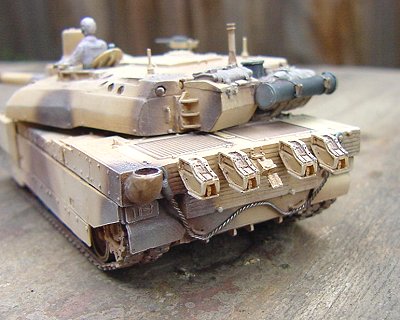 What I have painted, in fact, represents a French Leclerc on maneuvers in Qatar. It turns out that the UAE tanks have a very large number of very obvious differences from the French tanks. Even more than I imagined. While building my tank, I had seen photographs of tanks with two different "desert" paint schemes. I had incorrectly assumed that the solid yellow scheme was early UAE tanks, and the camouflaged version (which I painted) was a late UAE tank. In reality, the UAE tanks are the solid yellow ones, and like I said, have many obvious external differences from the French tanks. The paint scheme I used is for the French tanks in Qatar.