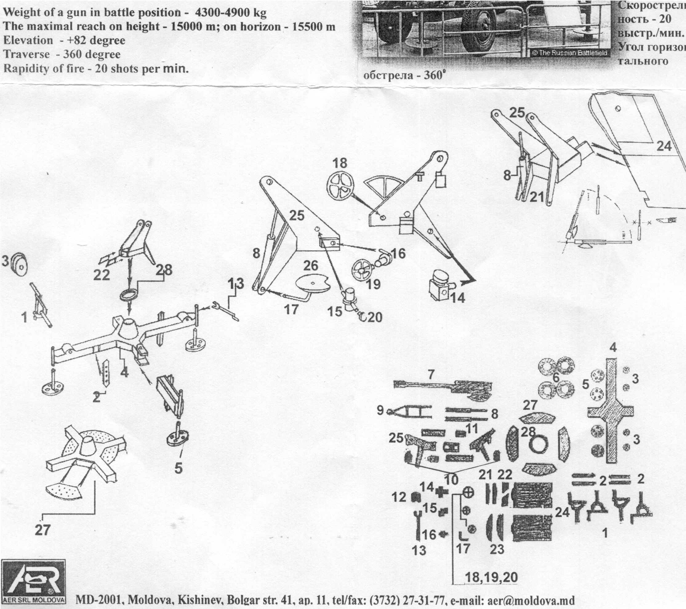 The kit instructions include a simple but adequate exploded-view diagram and a parts key at lower right. For assembly, glue with cyanoacrylate glue after washing well with detergent and then drying. Dry fit all parts before gluing and sand or file as needed to fit. Bent resin parts such as the gun barrel can usually be bent straight after immersing the part in hot water first. Acrylic or enamel paints should work well.